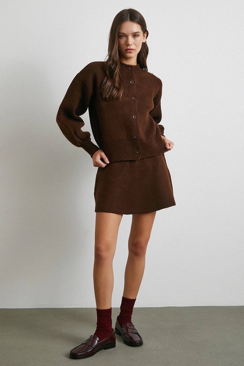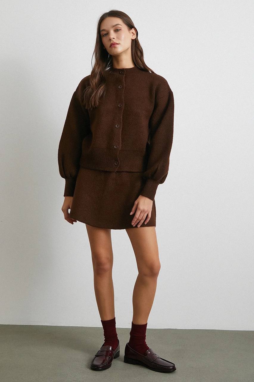 Женский Теплый Коричневый Костюм Двойка – Кардиган с Объемными Рукавами + Юбка Трапеция Мини