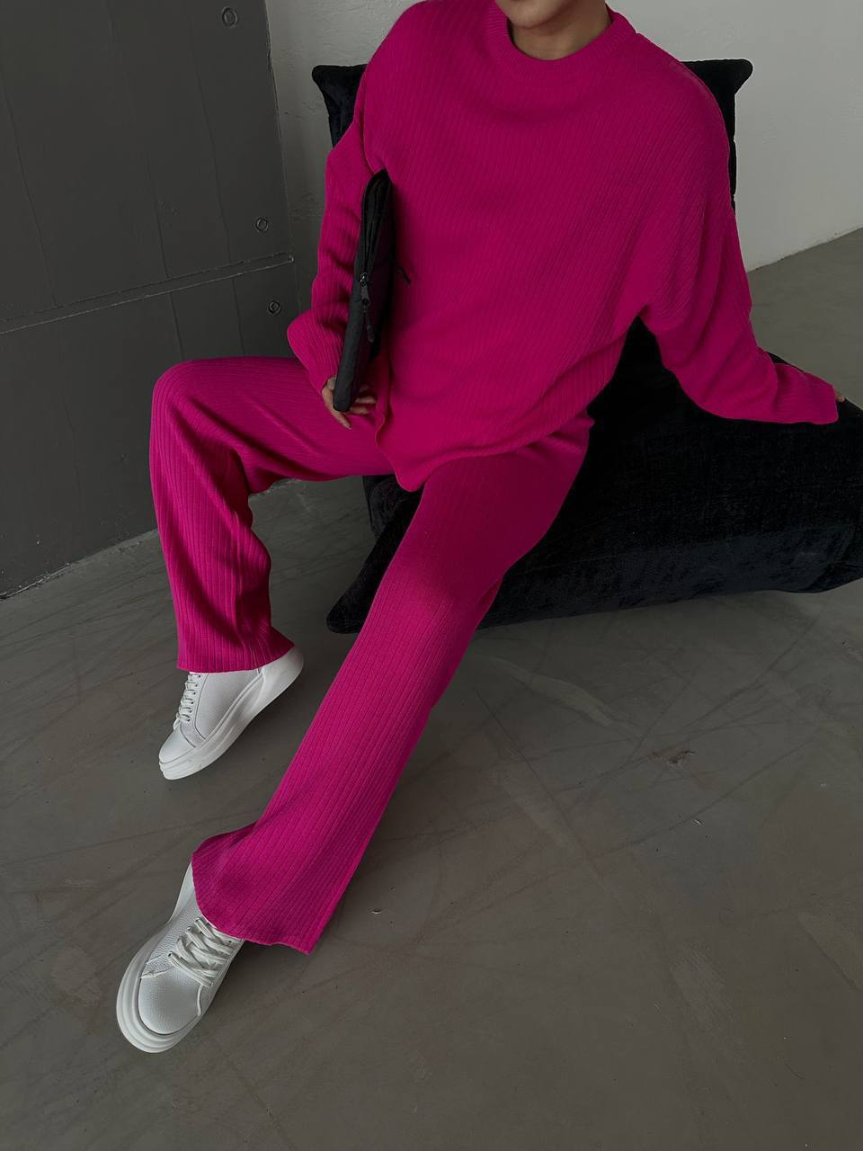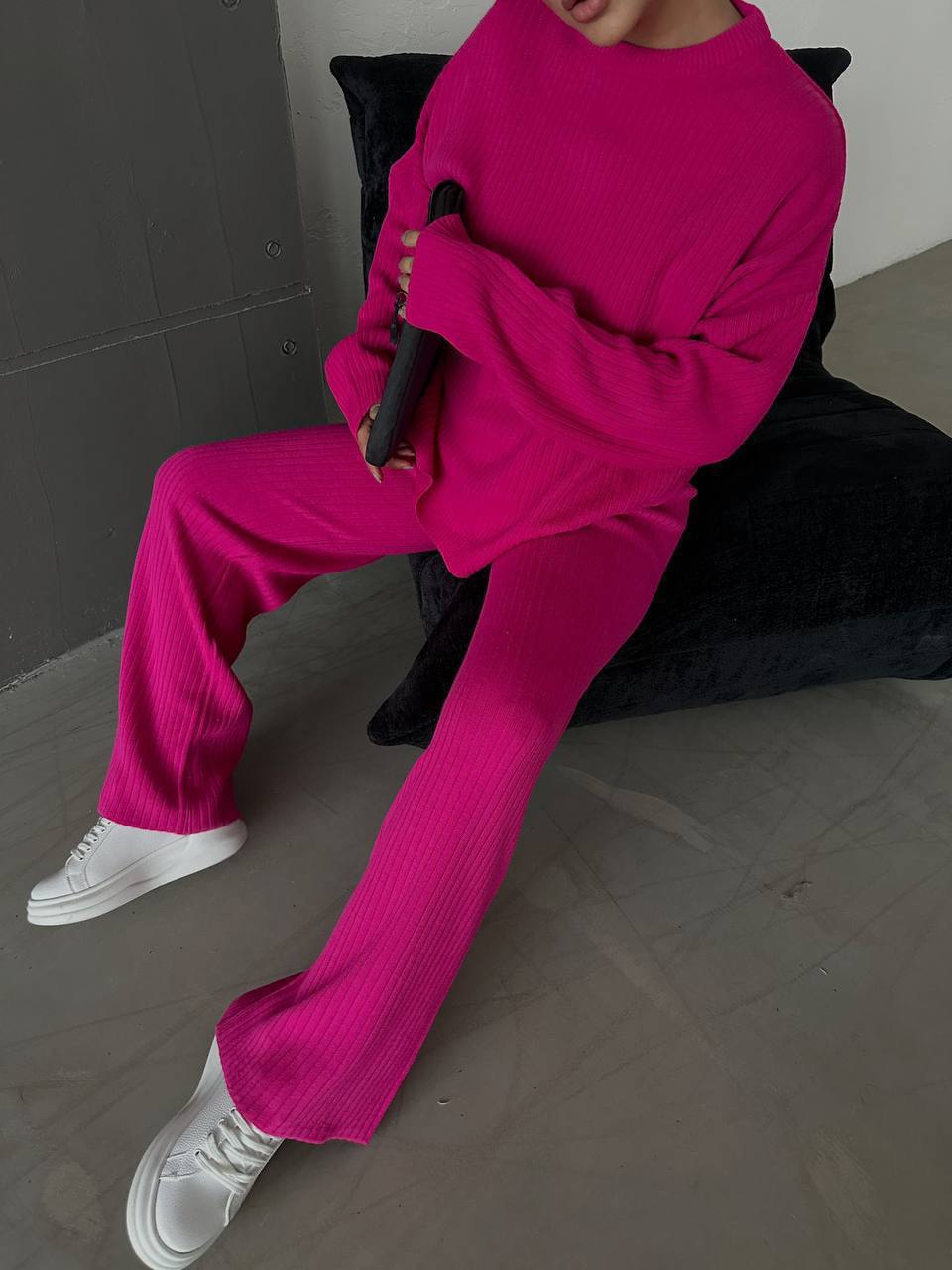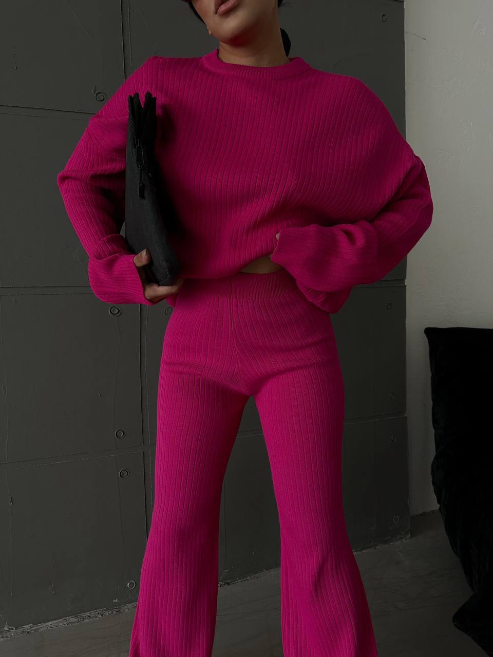 Женский Теплый Малиновый Костюм Свободного Кроя – Объемный Свитер + Штаны Палаццо