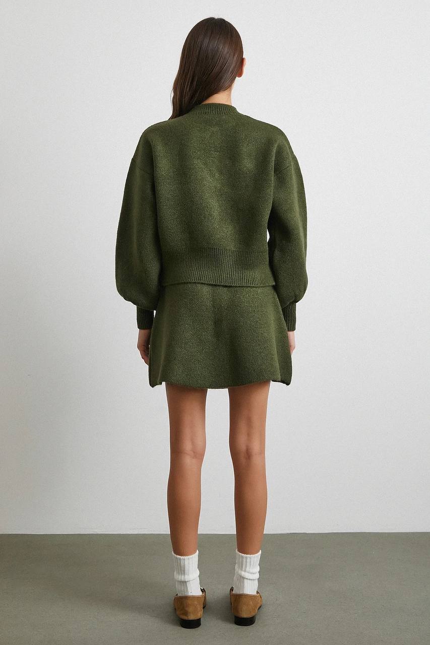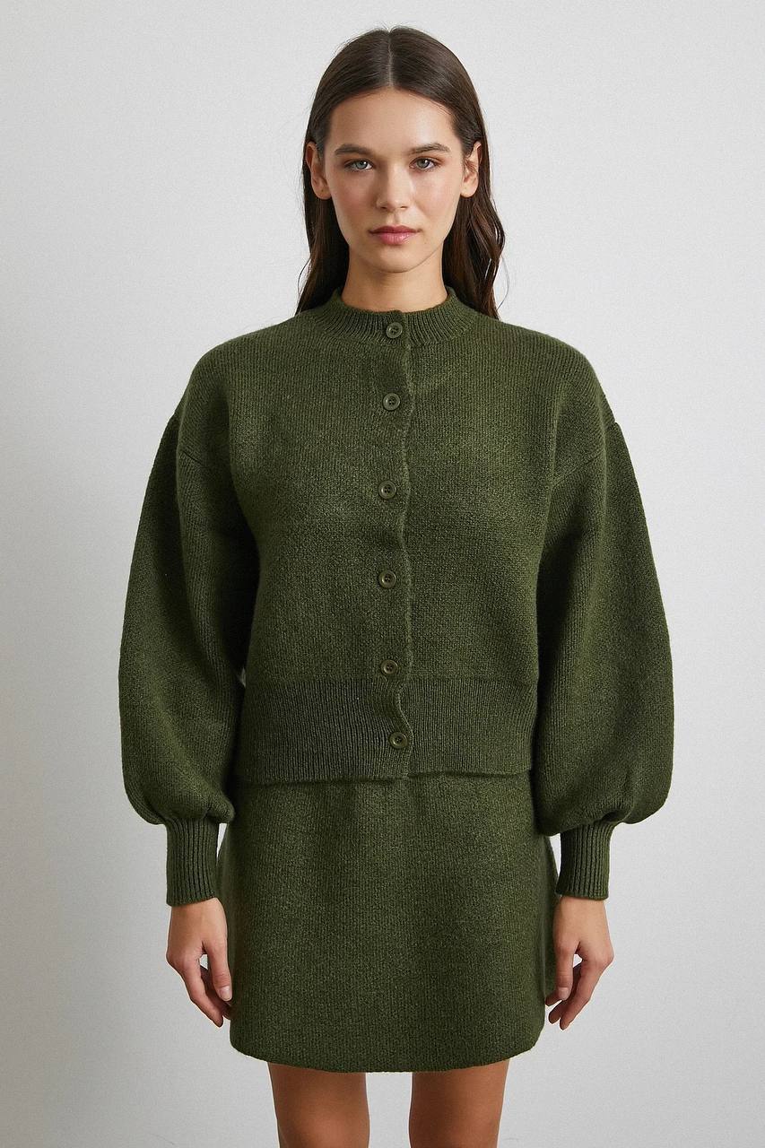 Женский Теплый Зеленый Костюм Двойка – Кардиган с Объемными Рукавами + Юбка Трапеция Мини