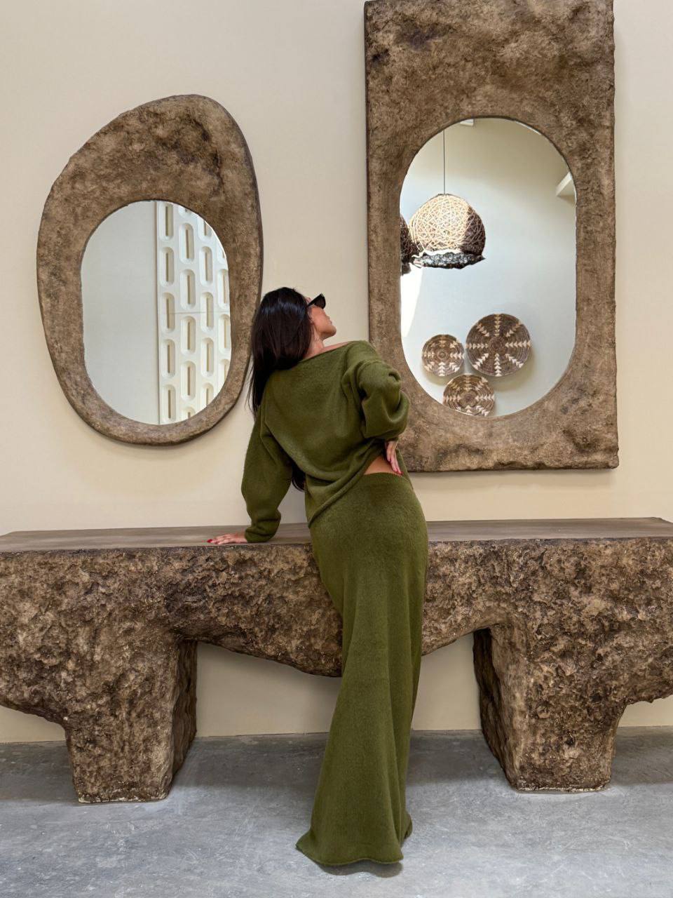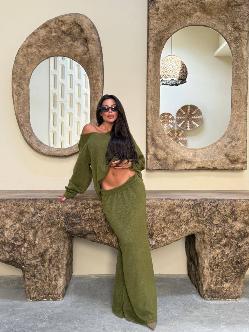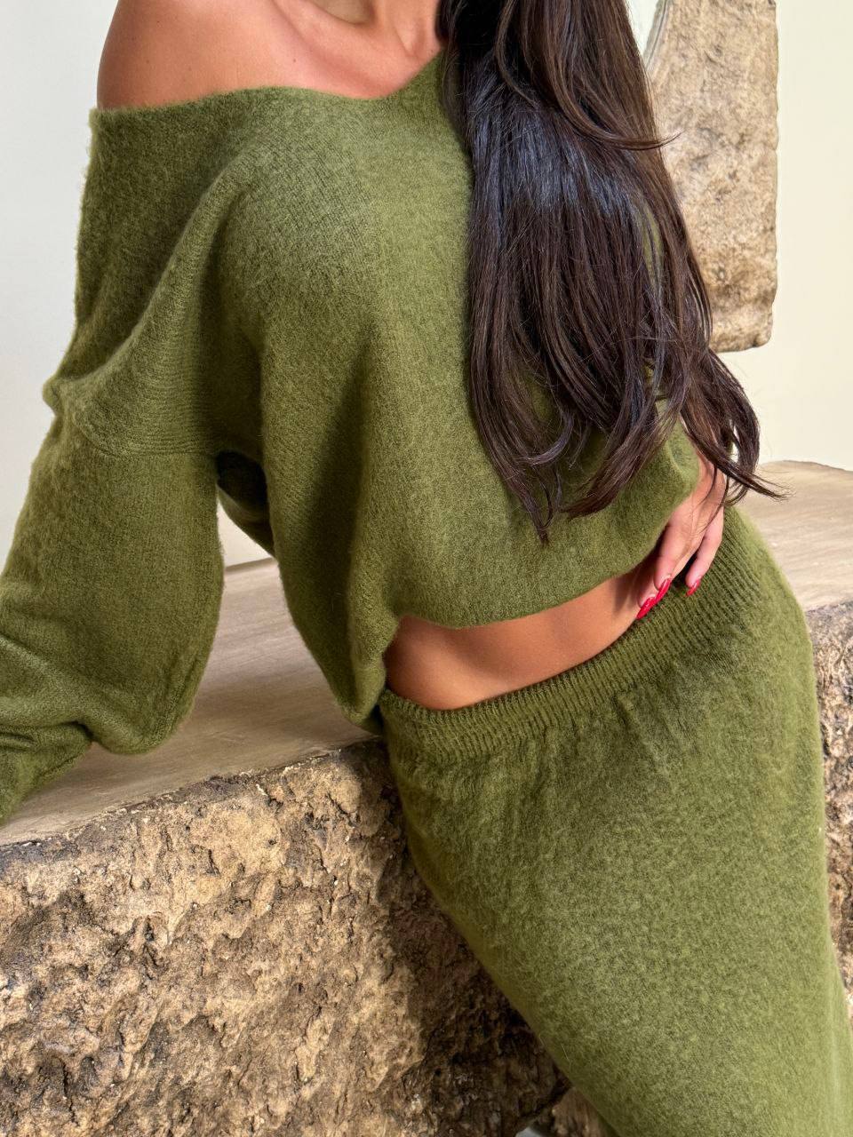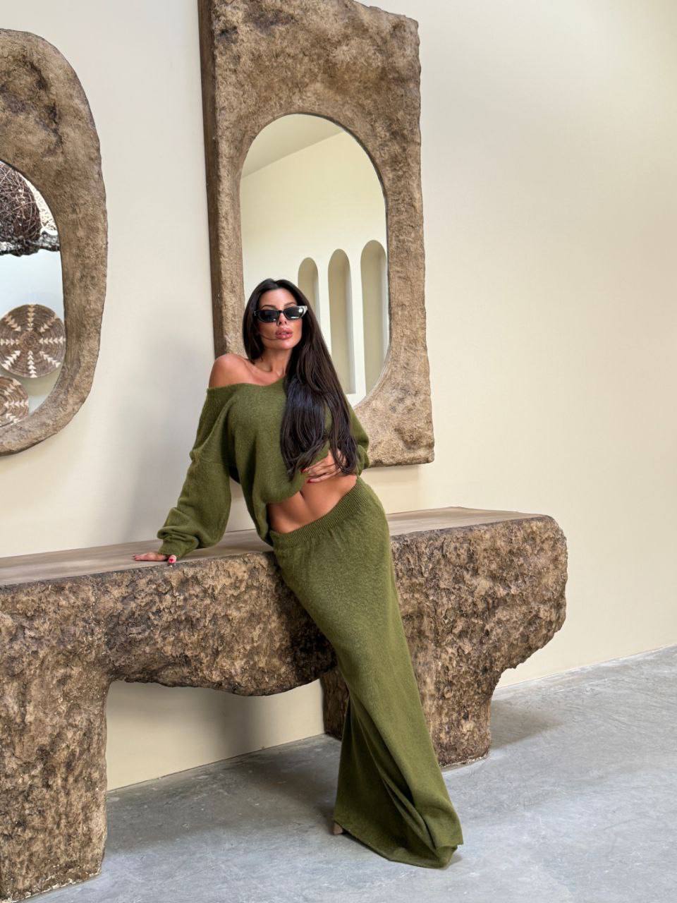 Женский Теплый Зеленый Костюм Оверсайз – Свободный Свитер + Юбка Макси