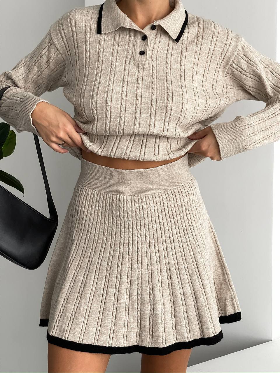 Женский Трикотажный Бежевый Костюм Двойка с Окантовкой – Кофта Поло + Юбка Мини