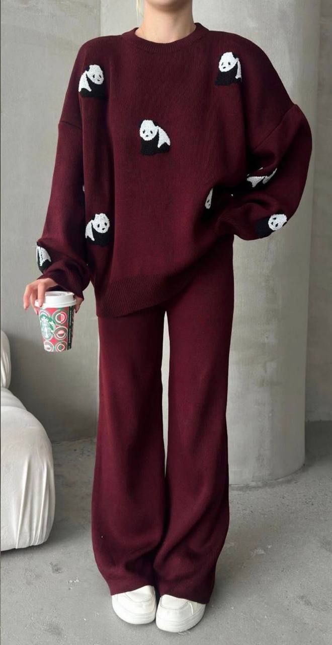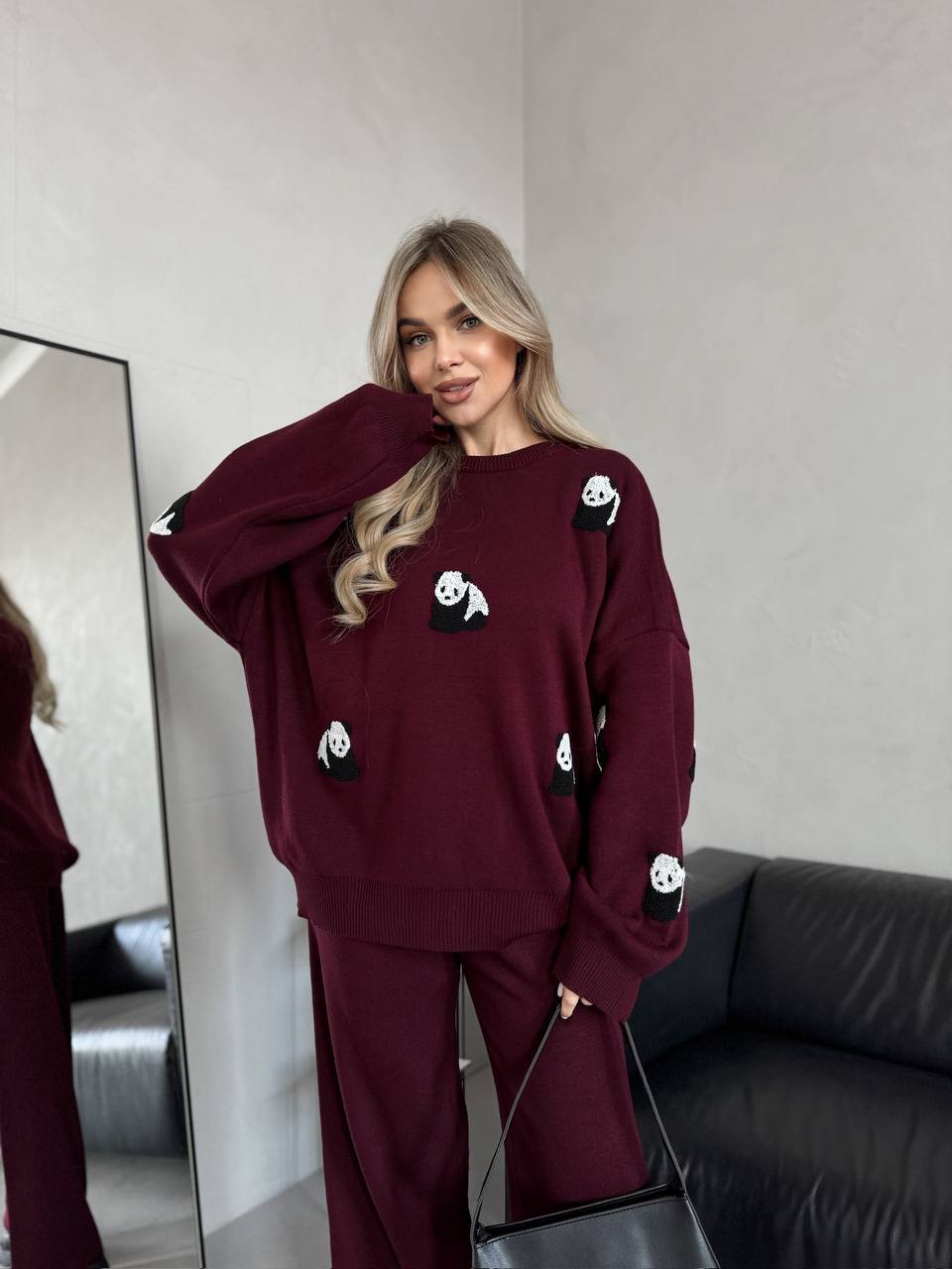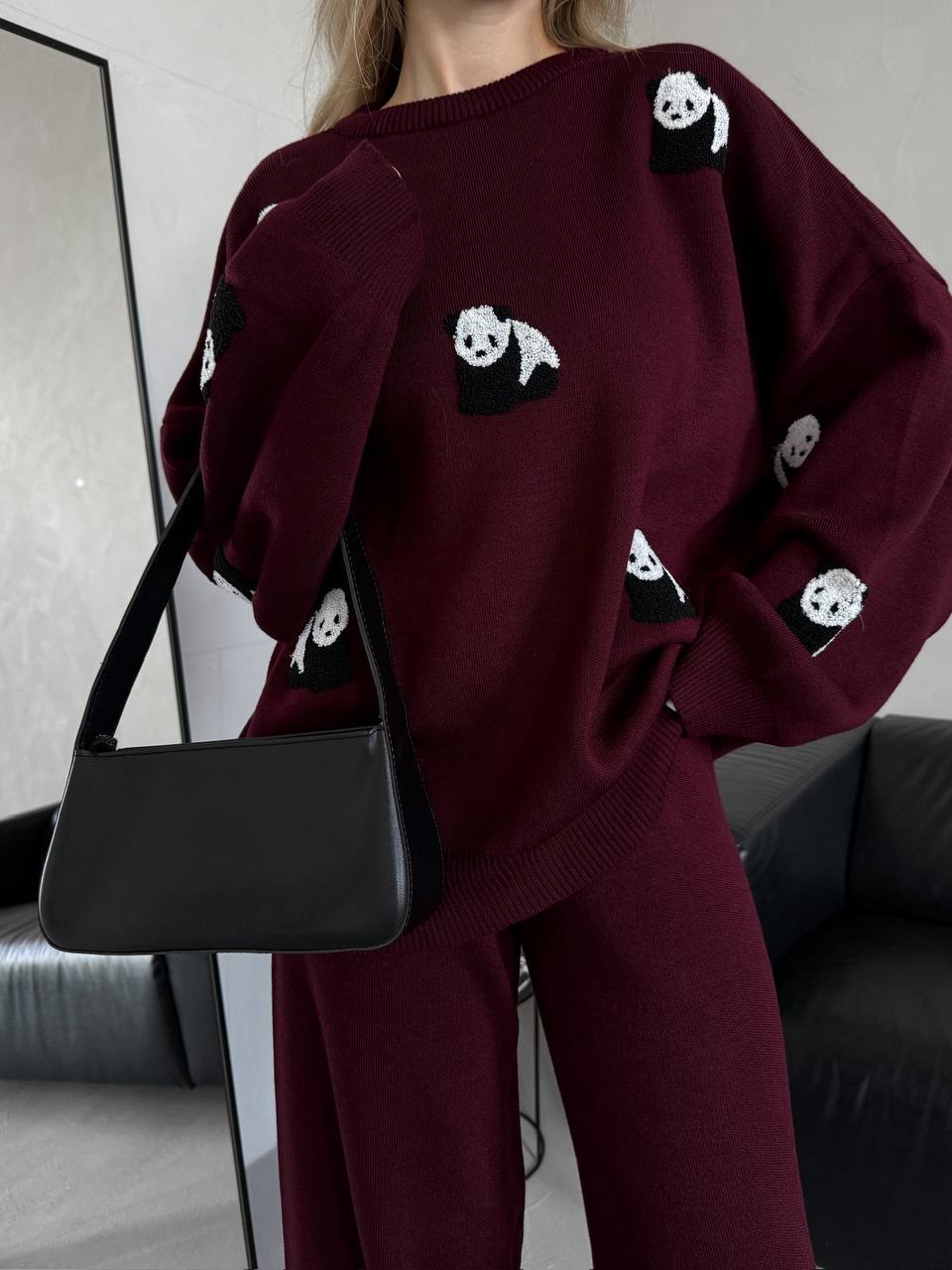 Женский Трикотажный Бордовый Костюм Оверсайз с Пандами – Комплект Свитер Штаны
