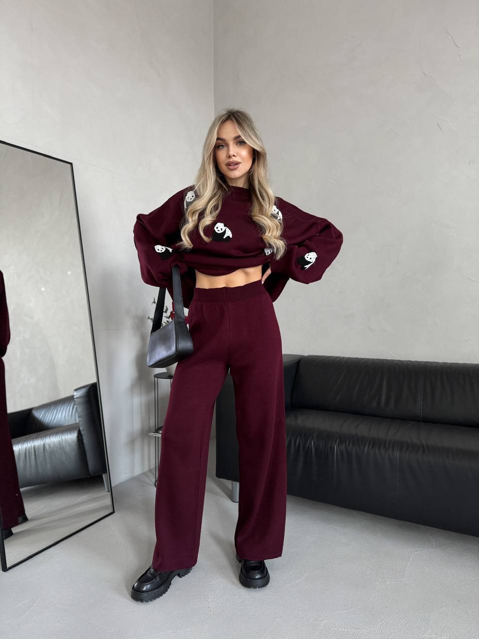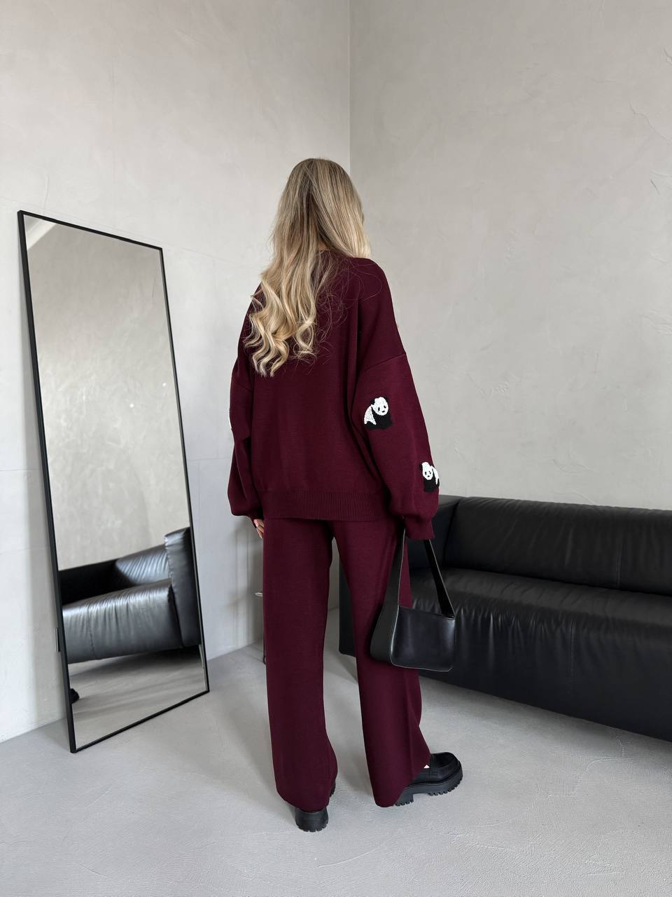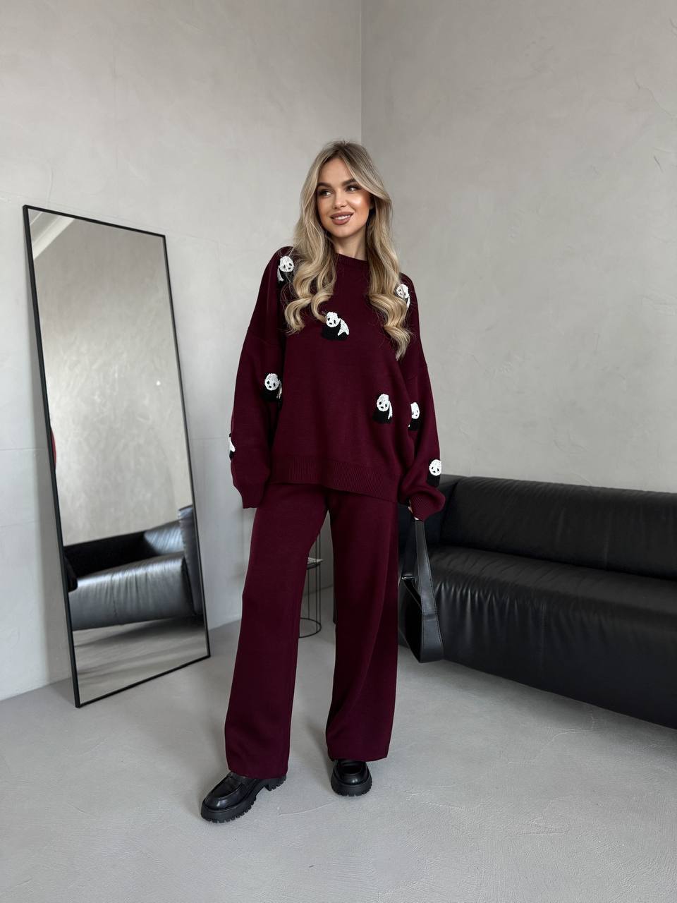 Женский Трикотажный Бордовый Костюм Оверсайз с Пандами – Комплект Свитер Штаны