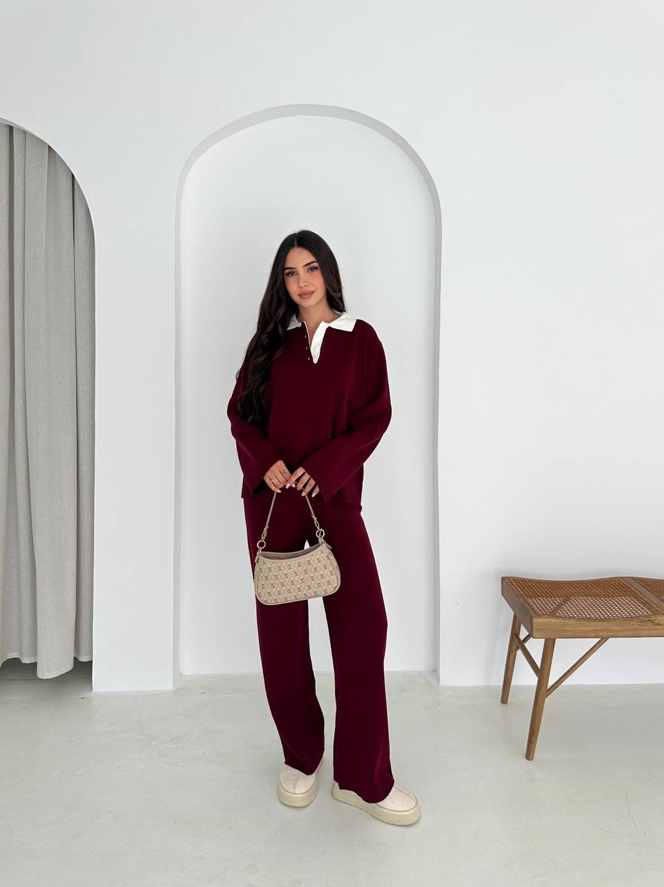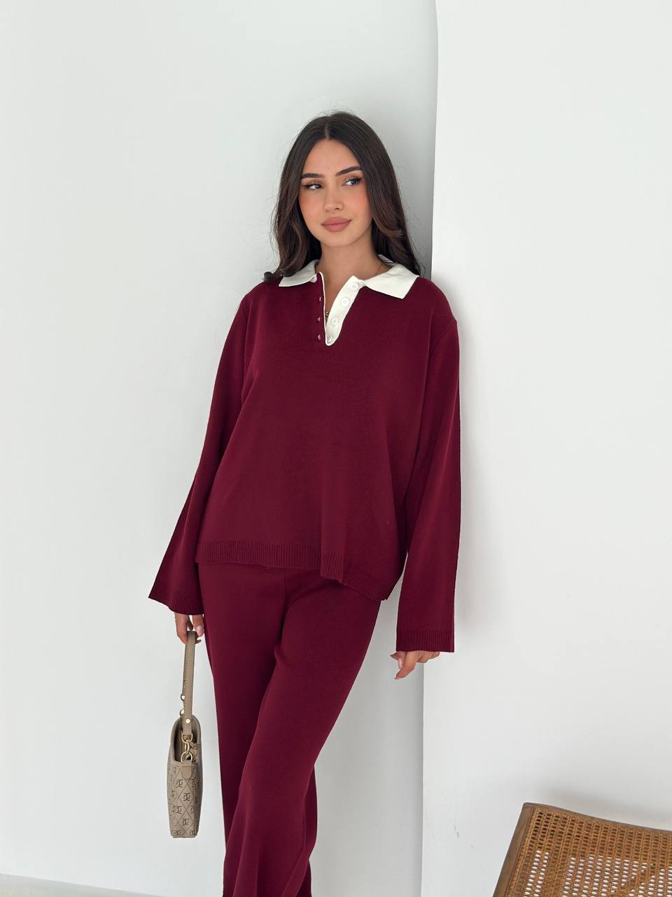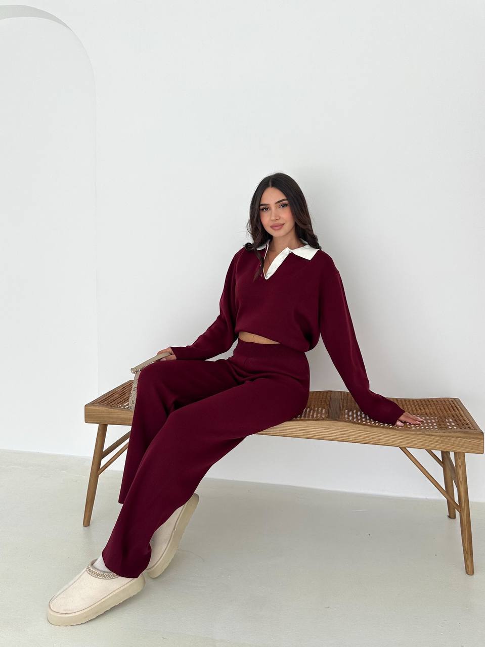 Женский Трикотажный Бордовый Костюм с Контрастным Воротником – Свитер Оверсайз + Широкие Штаны