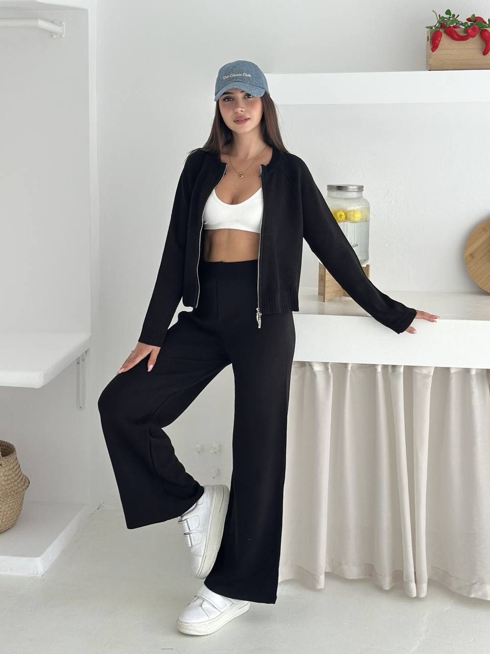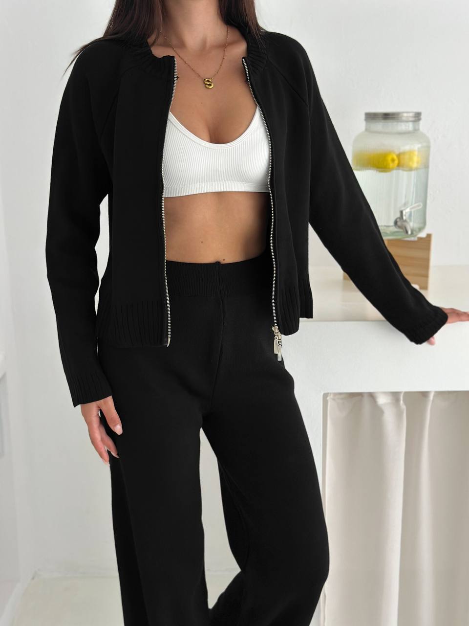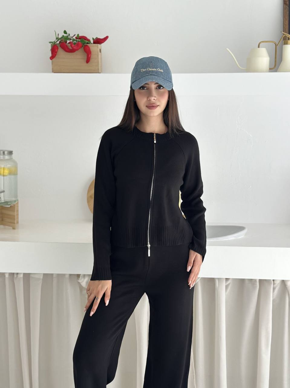 Женский Трикотажный Черный Костюм Двойка – Джемпер на Молнии + Штаны Палаццо