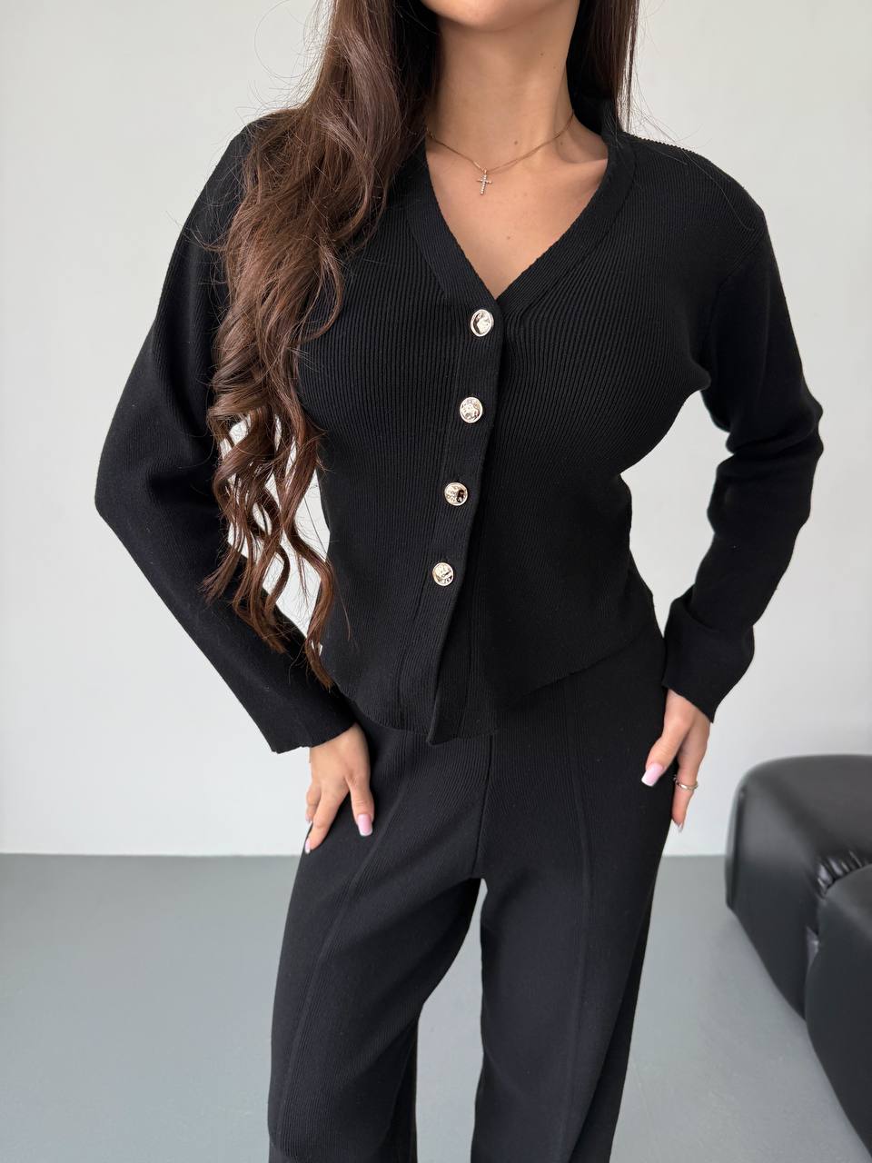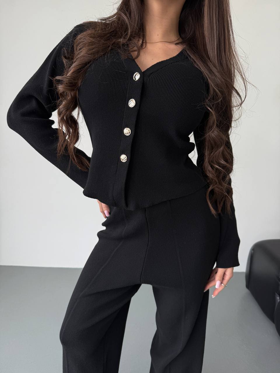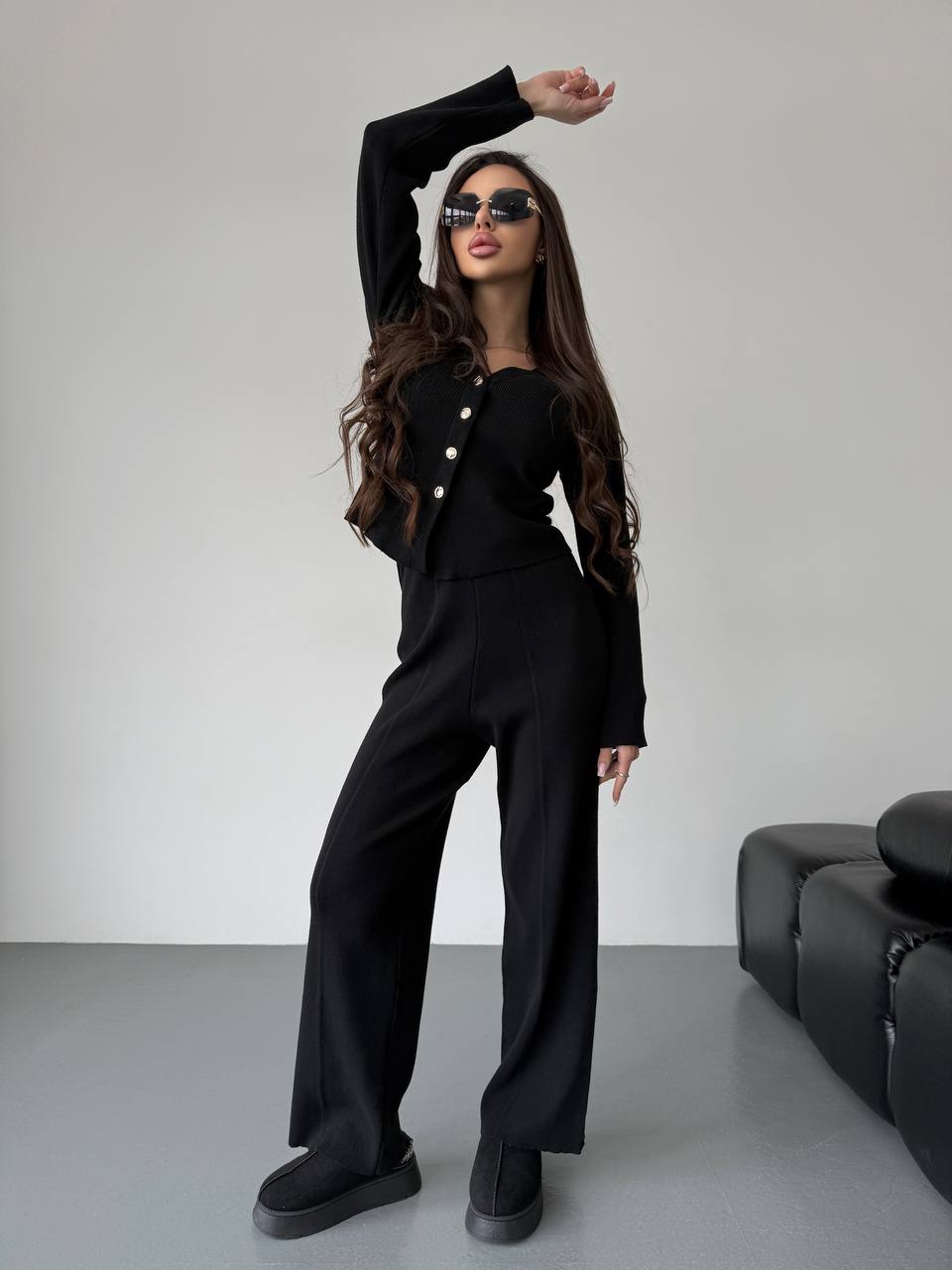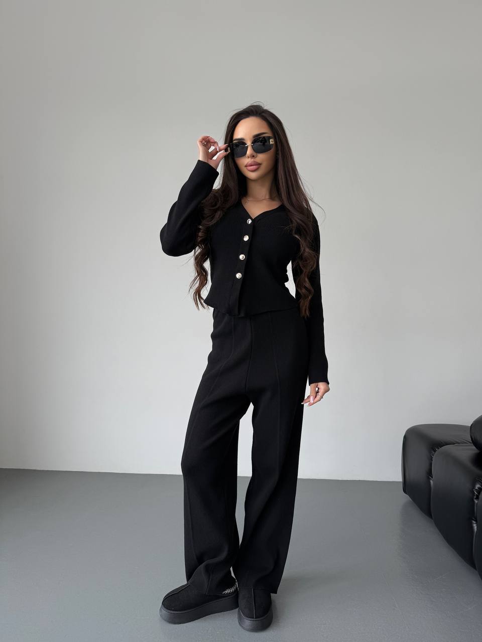 Женский Трикотажный Черный Костюм – Кардиган + Свободные Штаны