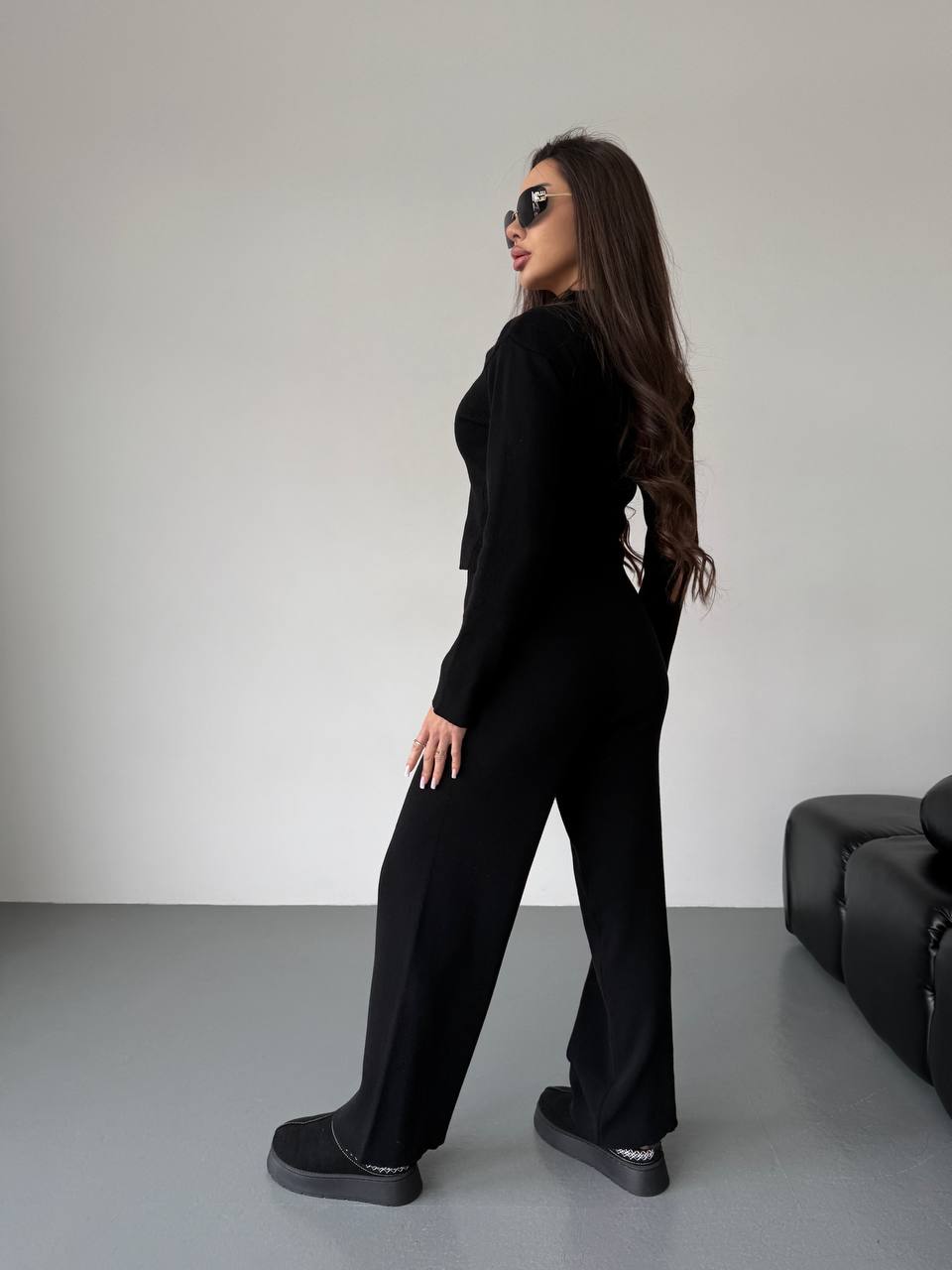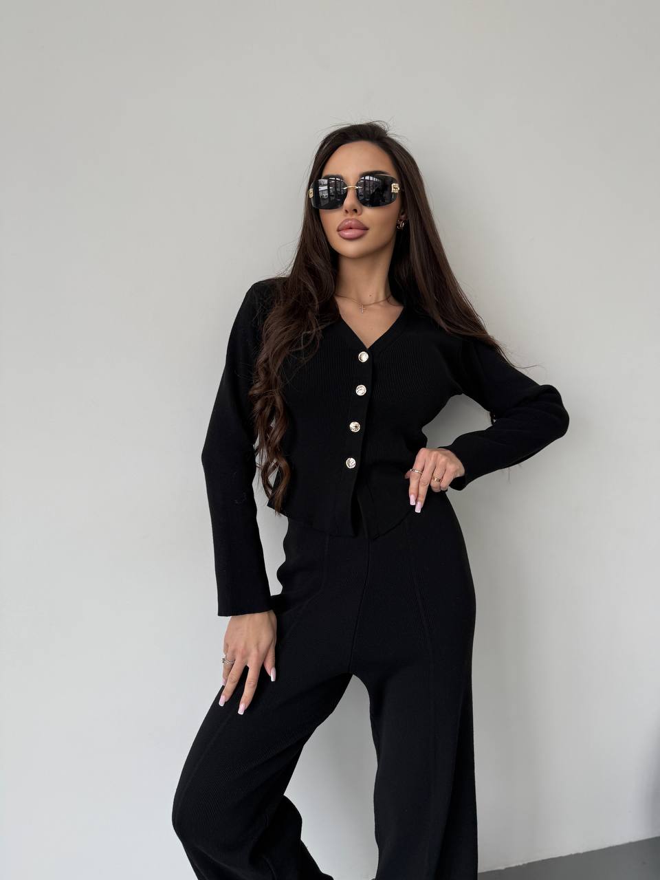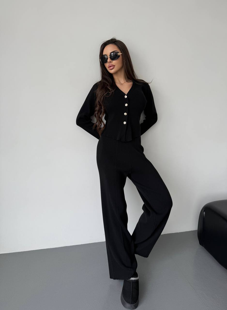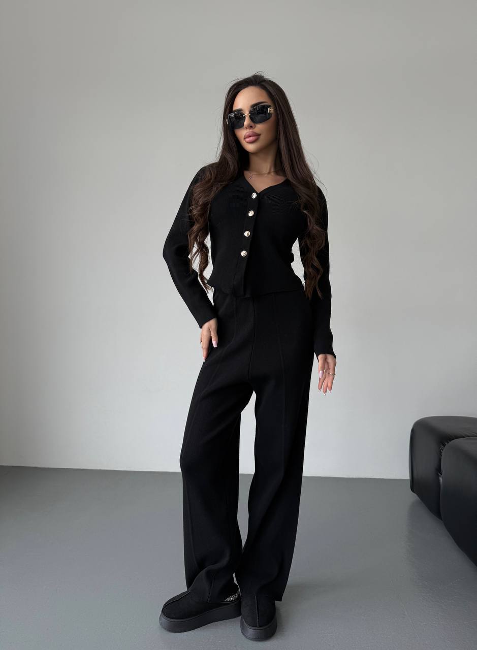 Женский Трикотажный Черный Костюм - Кардиган + Свободные Штаны