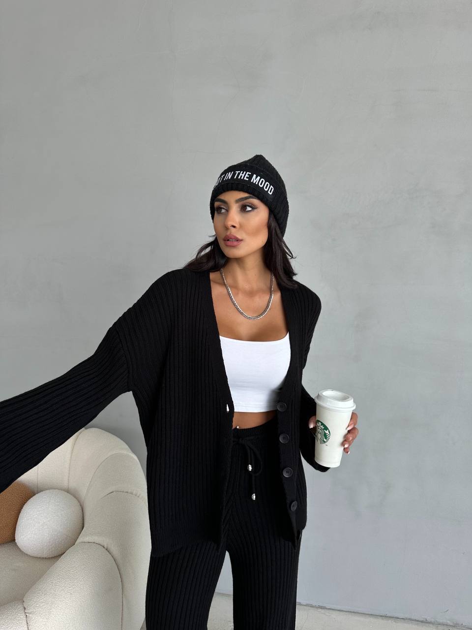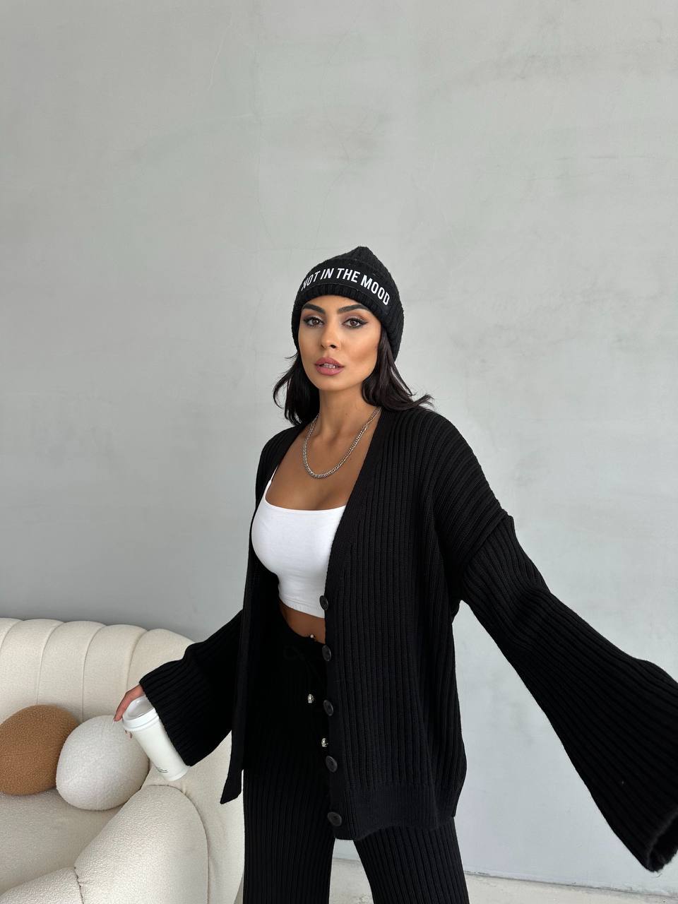 Женский Трикотажный Черный Костюм Свободного Кроя в Фактурную Полоску (Кардиган + Штаны)