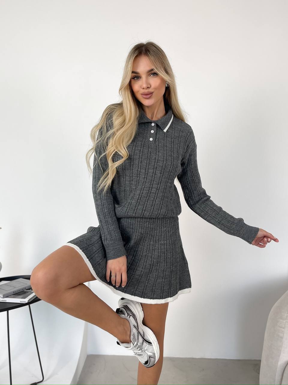 Женский Трикотажный Графитовый Костюм Двойка с Окантовкой – Кофта Поло + Юбка Мини