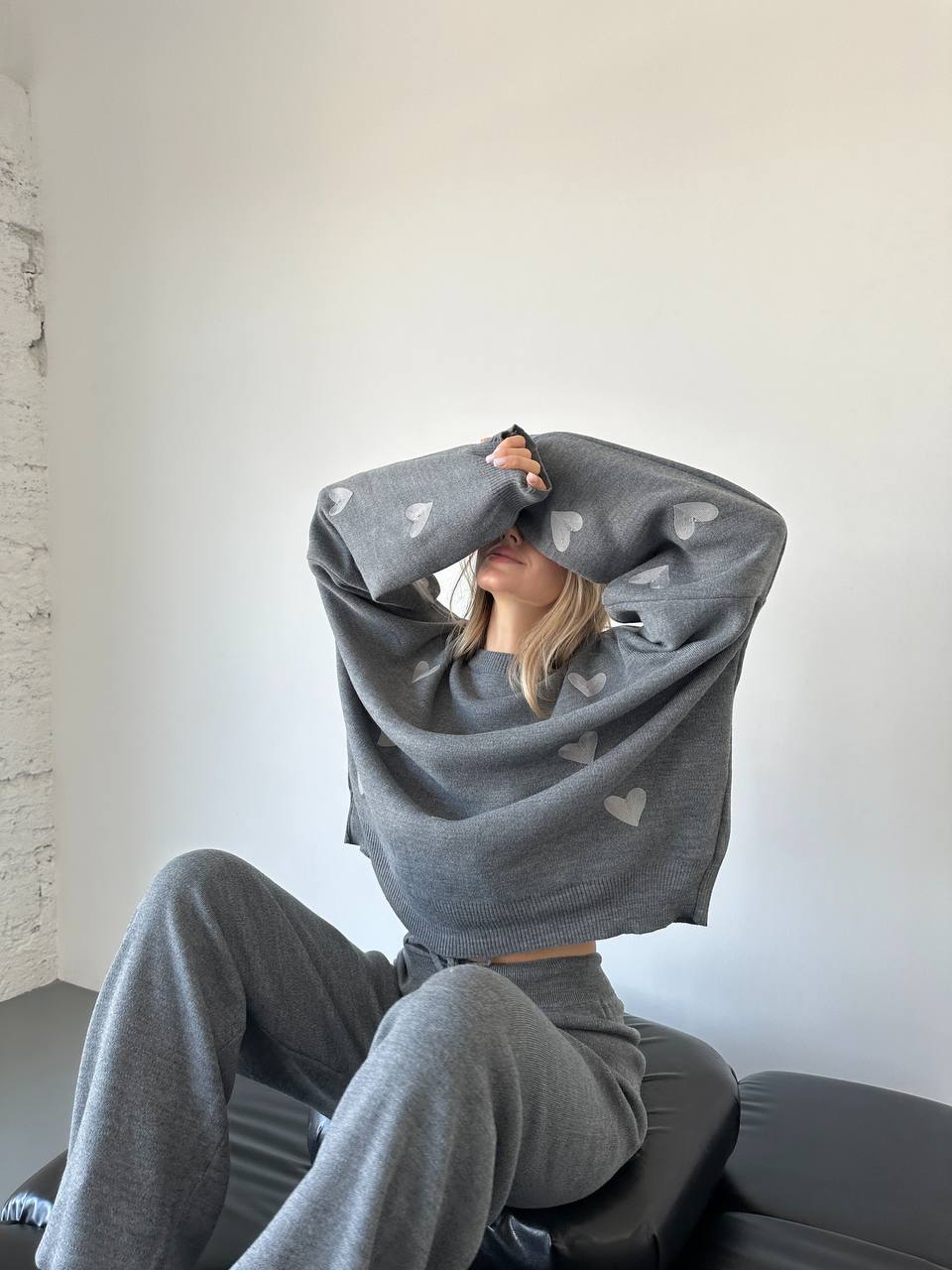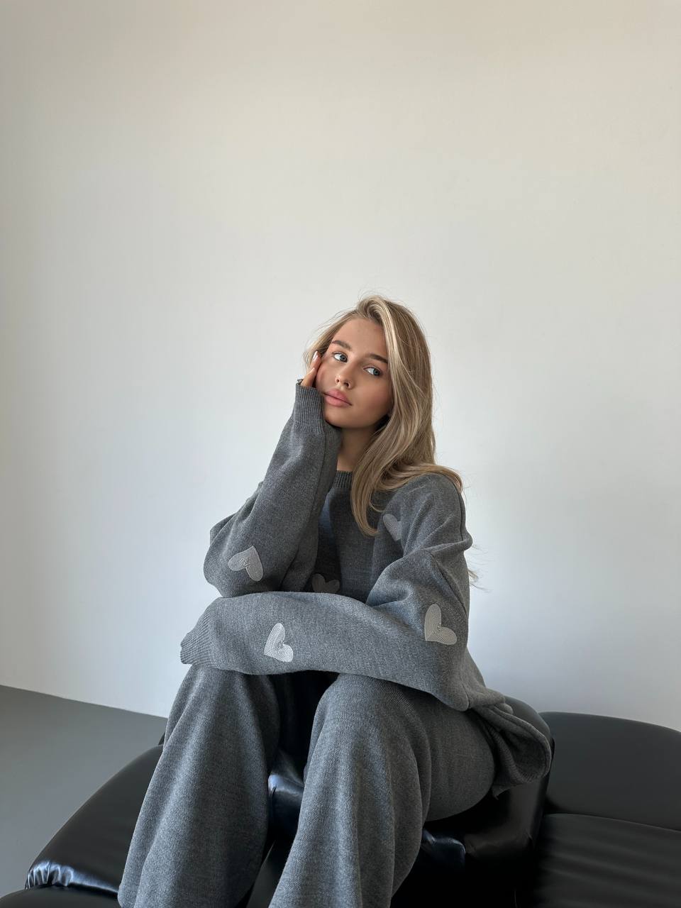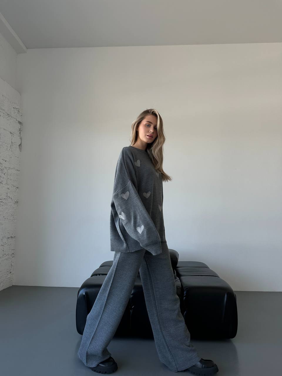 Женский Трикотажный Графитовый Костюм Оверсайз с Серыми Сердечками – Объемный Свитер + Штаны Палаццо