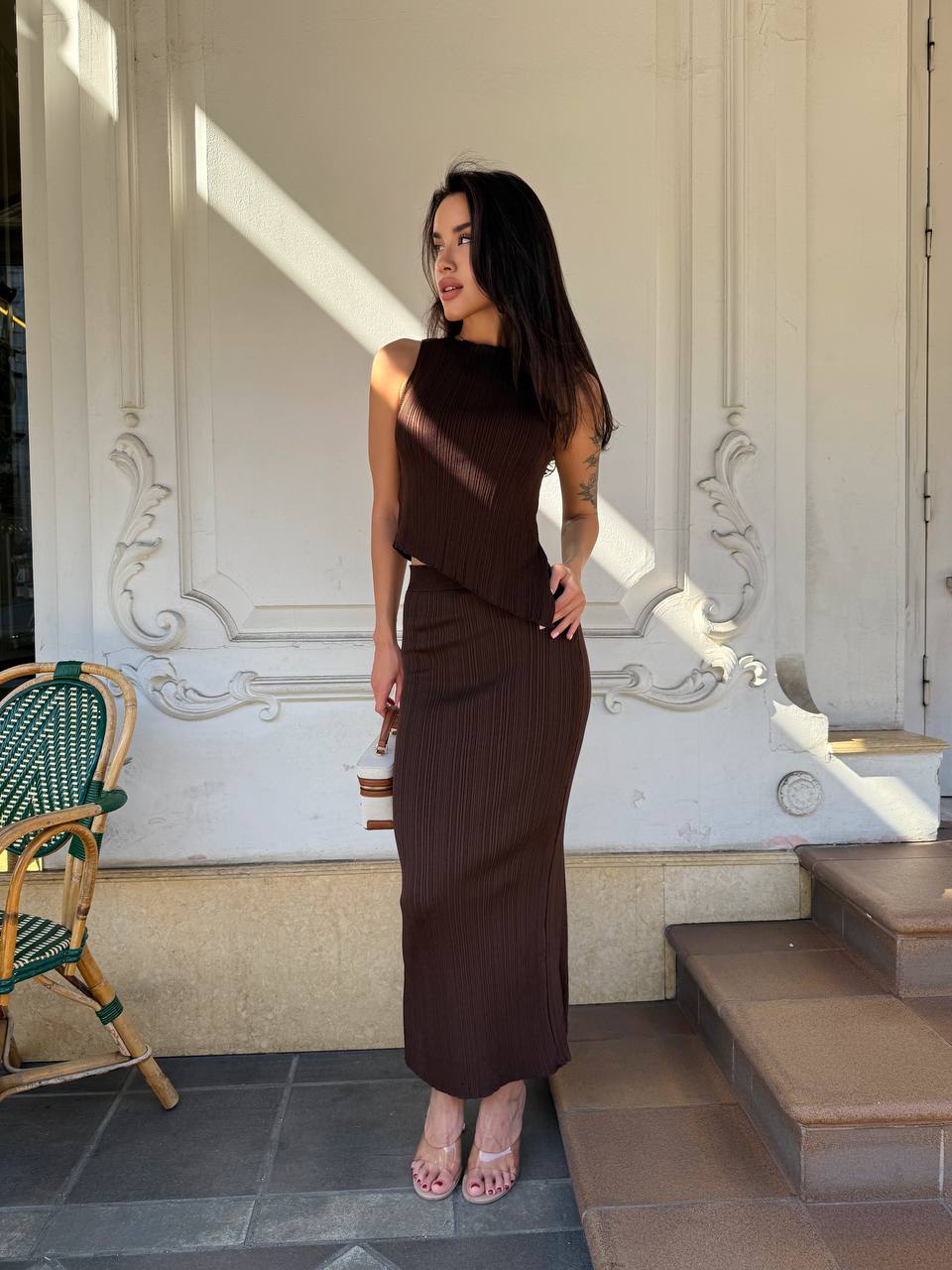 Женский Трикотажный Коричневый Костюм – Асимметричный Топ + Длинная Юбка с Разрезом