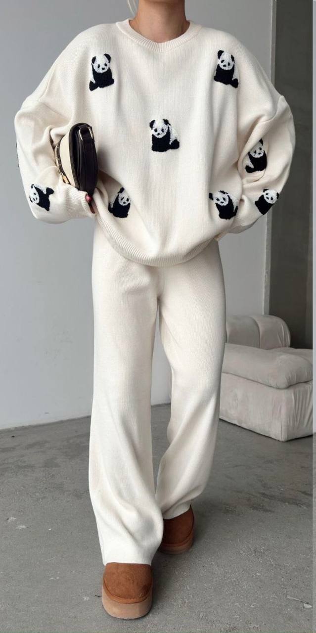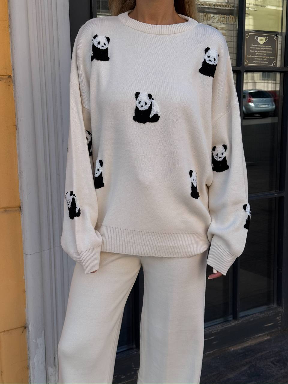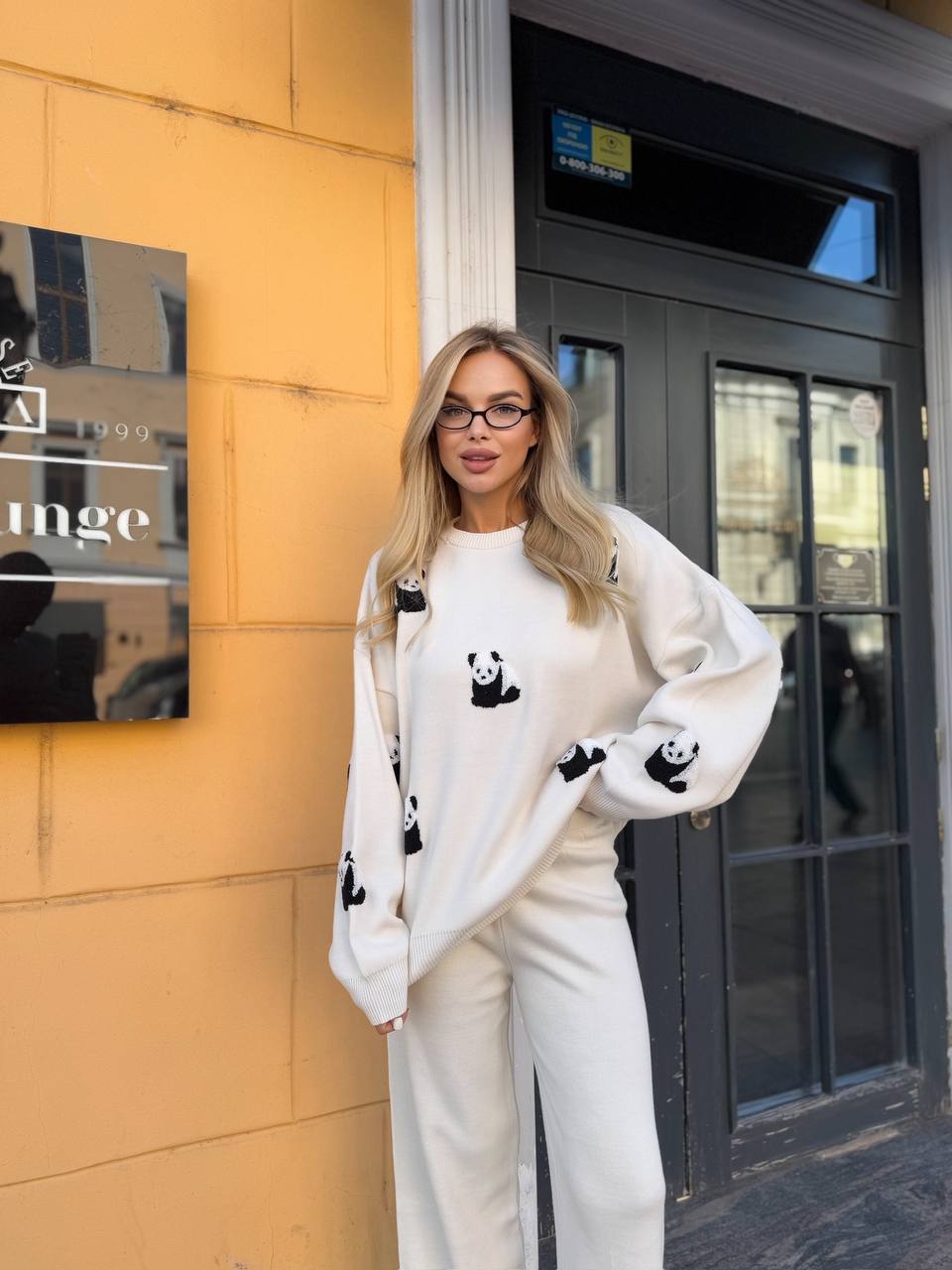 Женский Трикотажный Молочный Костюм Оверсайз с Пандами – Комплект Свитер Штаны