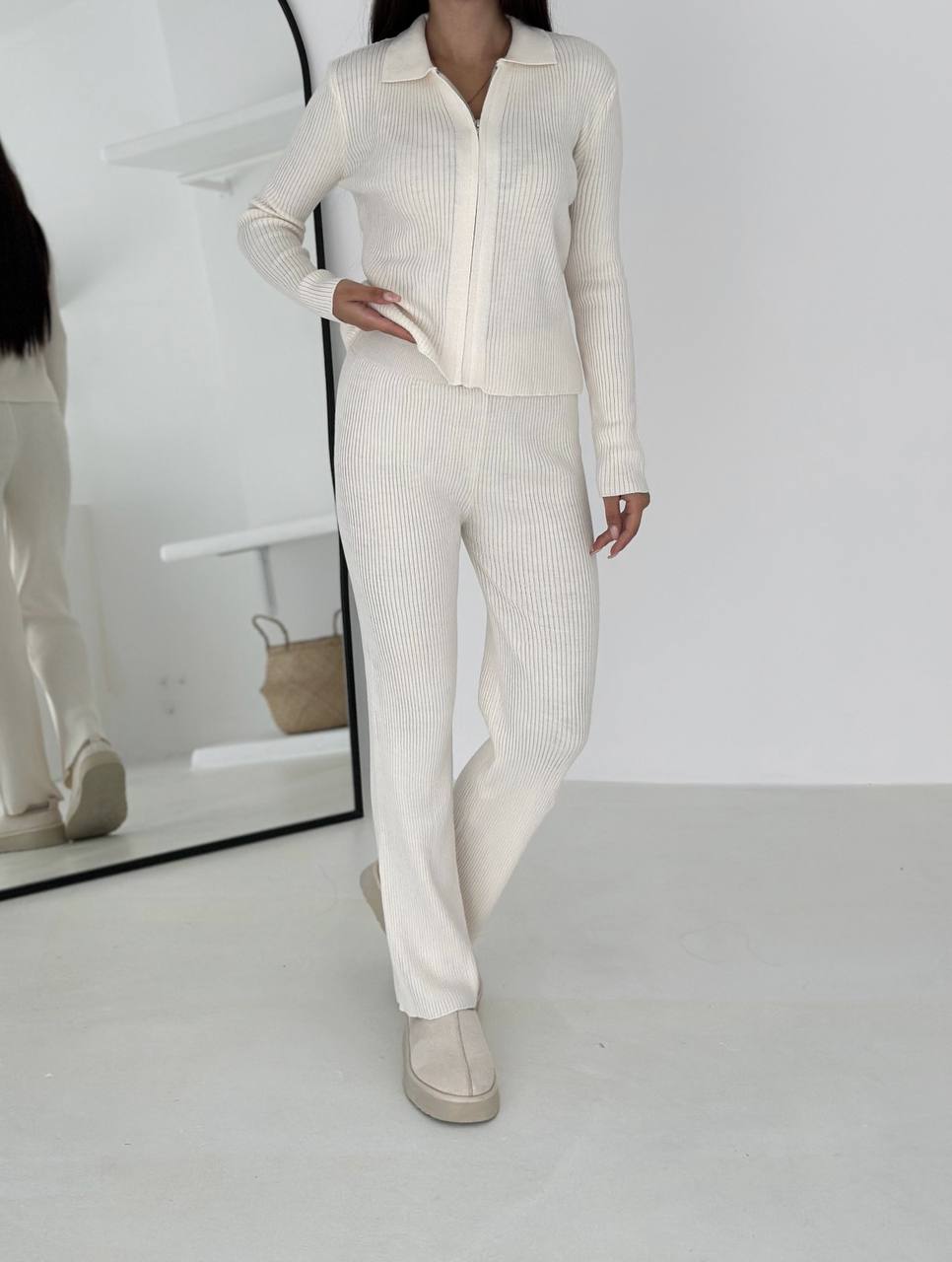 Женский Трикотажный Молочный Костюм в Рубчик – Джемпер на Змейке с Воротником + Штаны Палаццо