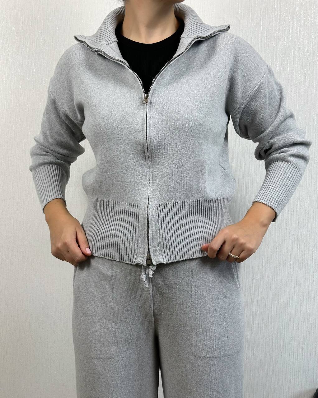 Женский Трикотажный Серый Костюм Свободного Кроя на Молнии (Кофта + Штаны)