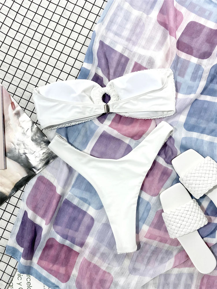 Женский Раздельный Белый Купальник с Макраме – Бандо с Кольцом + Трусики Бикини