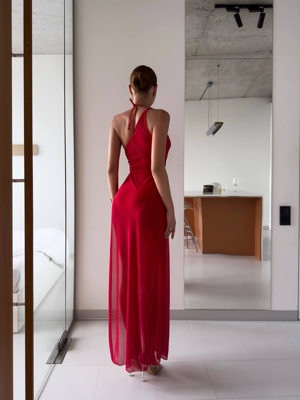 Женский Раздельный Красный Купальник Треугольник Шторки + Длинная Полупрозрачная Накидка