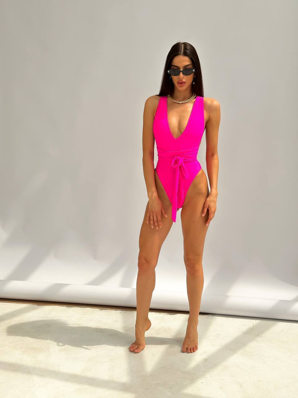 Женский Слитный Купальник Розовый – Высокая Посадка с Глубоким Вырезом Декольте и Шнуровкой