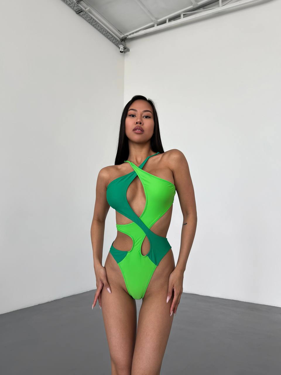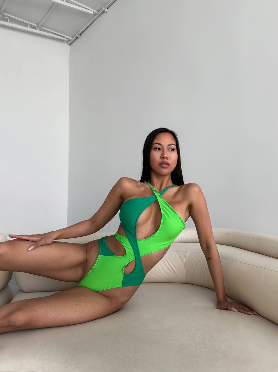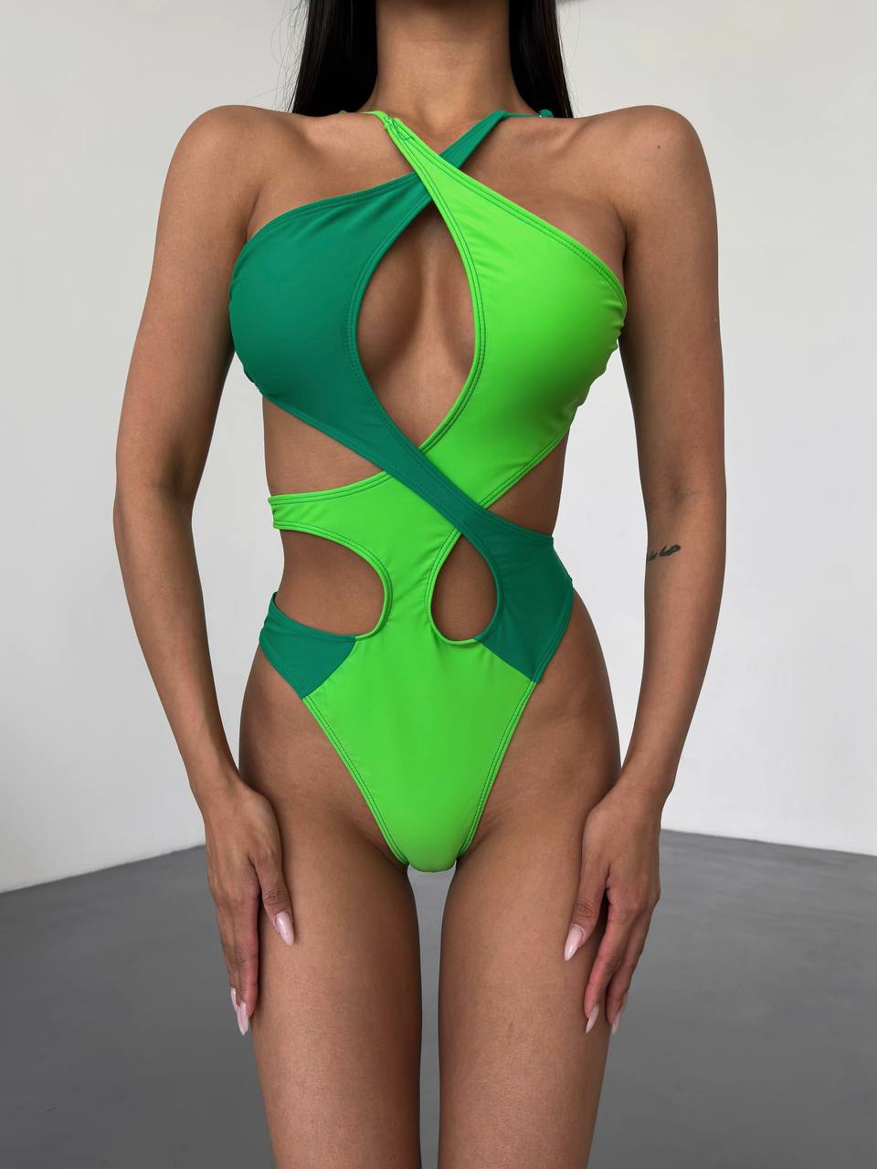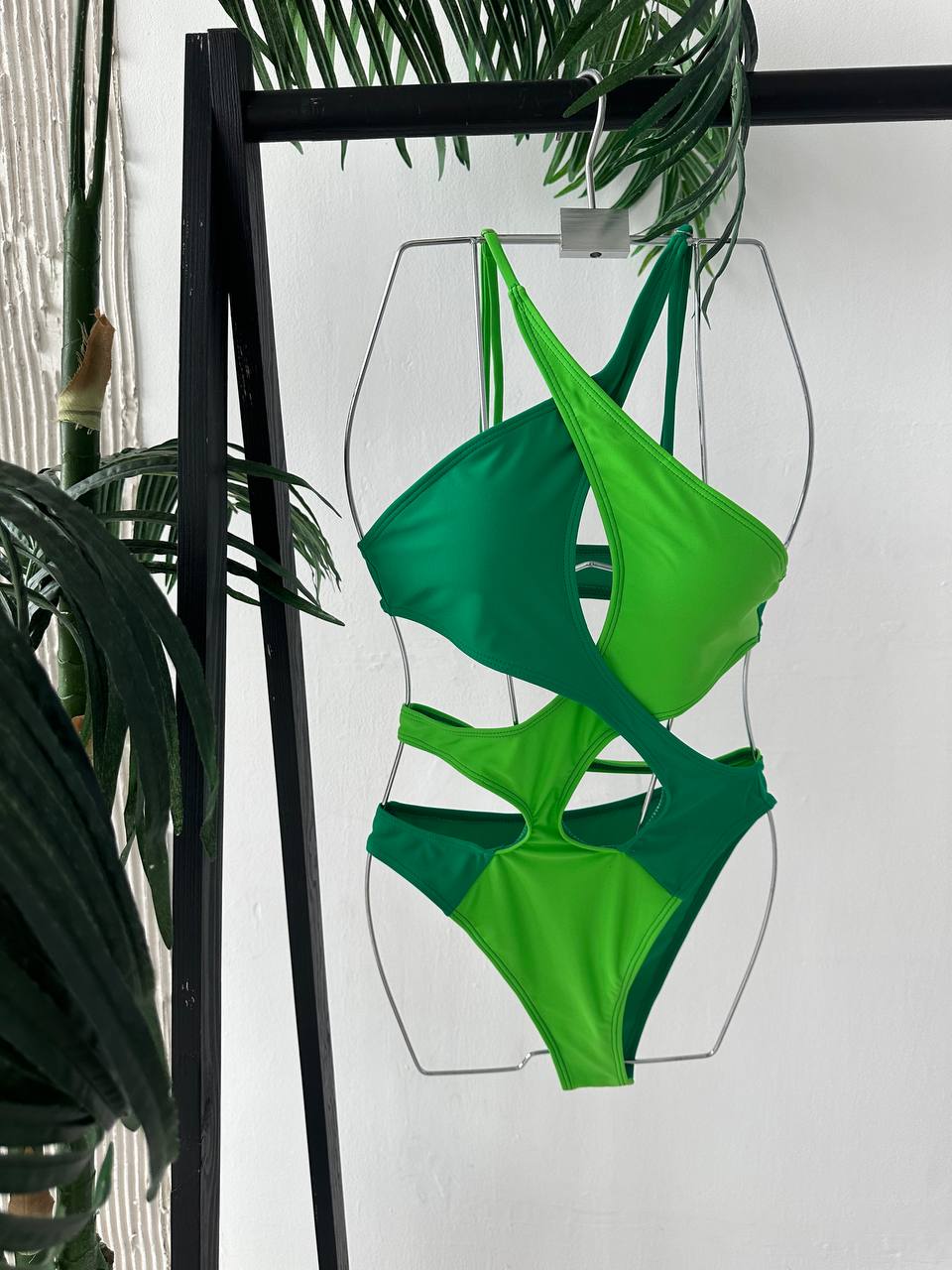 Женский Сплошной Двухцветный Зеленый Купальник с Переплетами