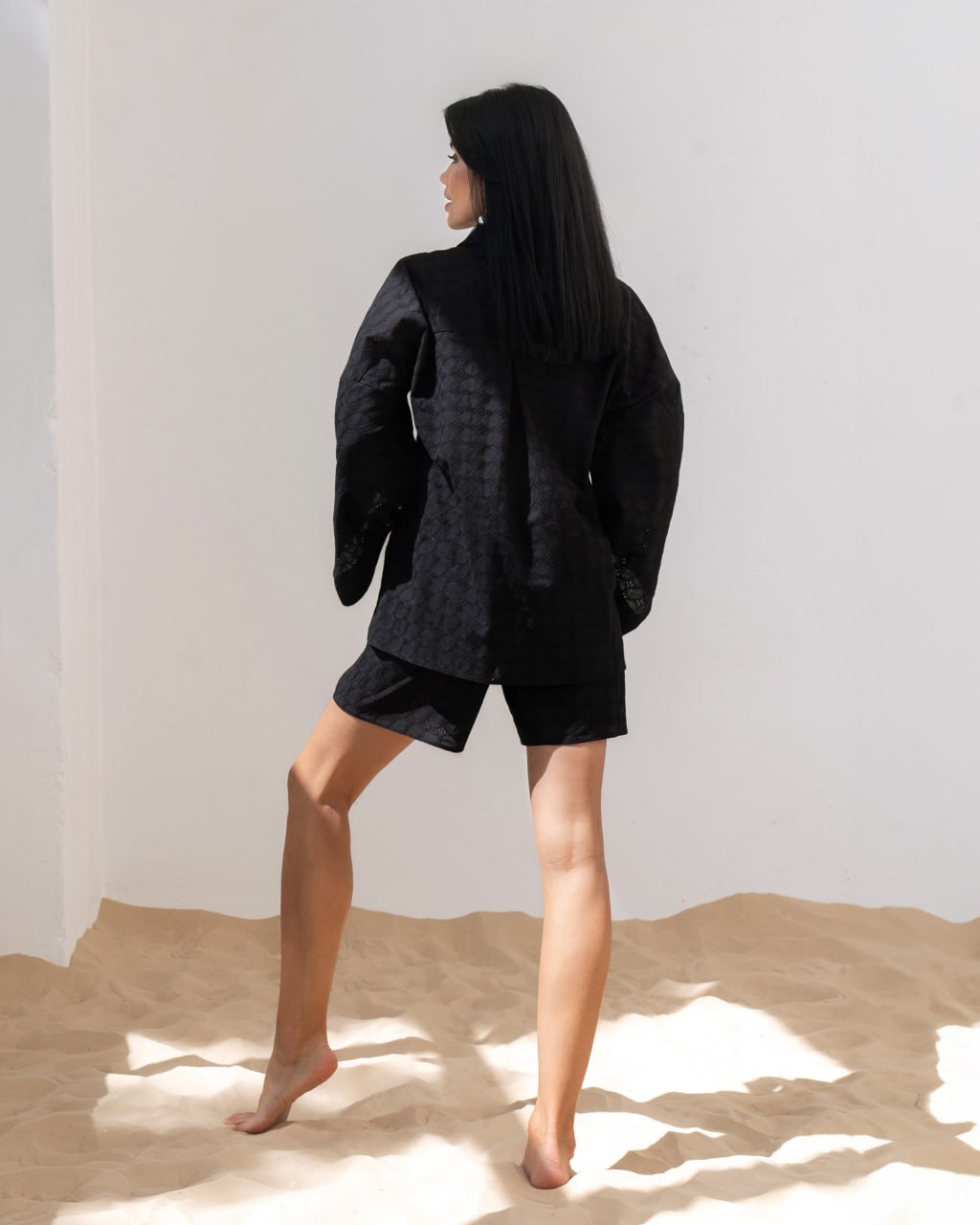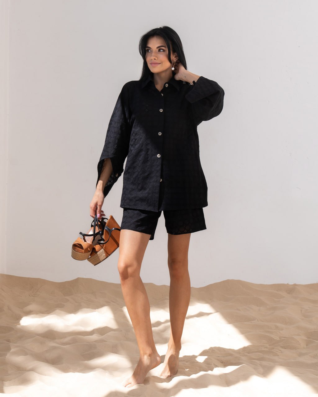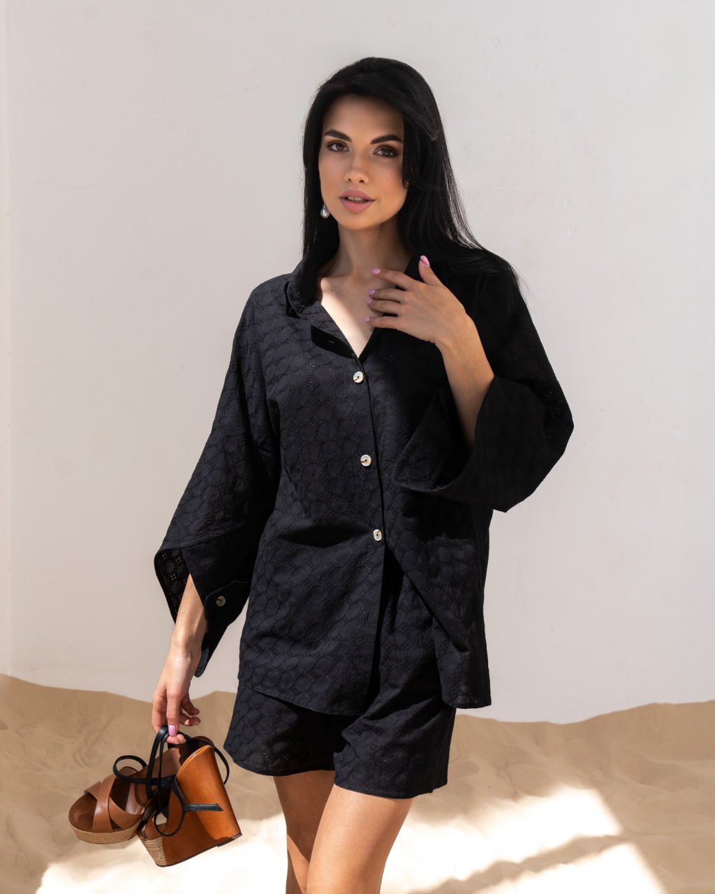 Женский Летний Черный Костюм Тандем из Прошвы (Рубашка + Шорты)