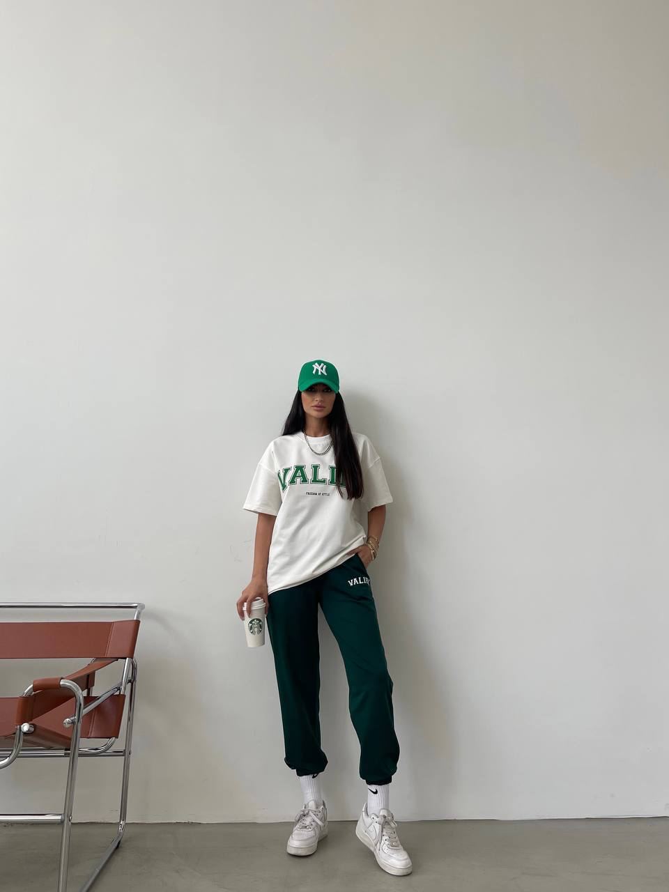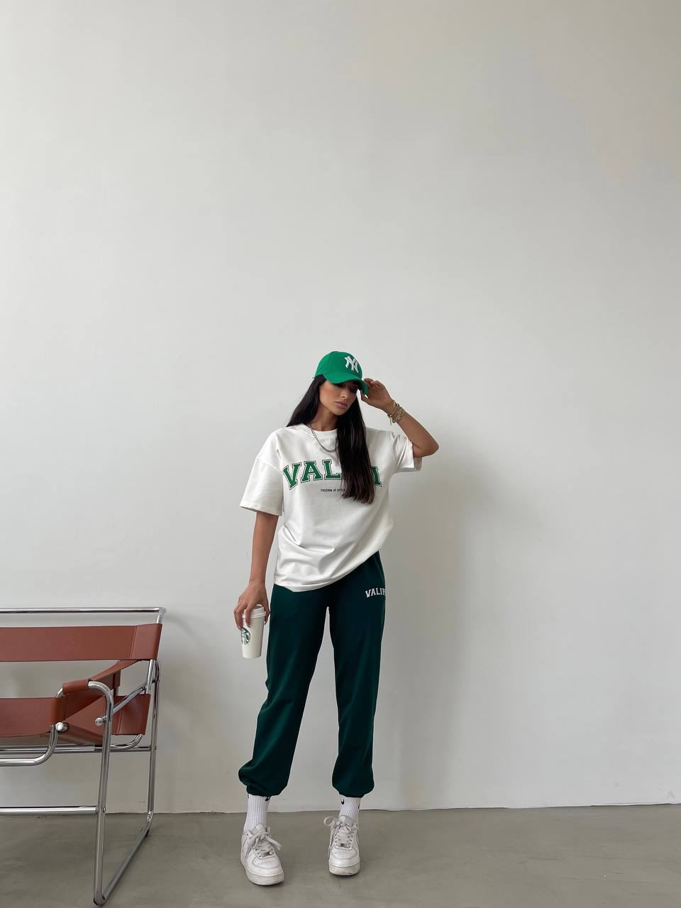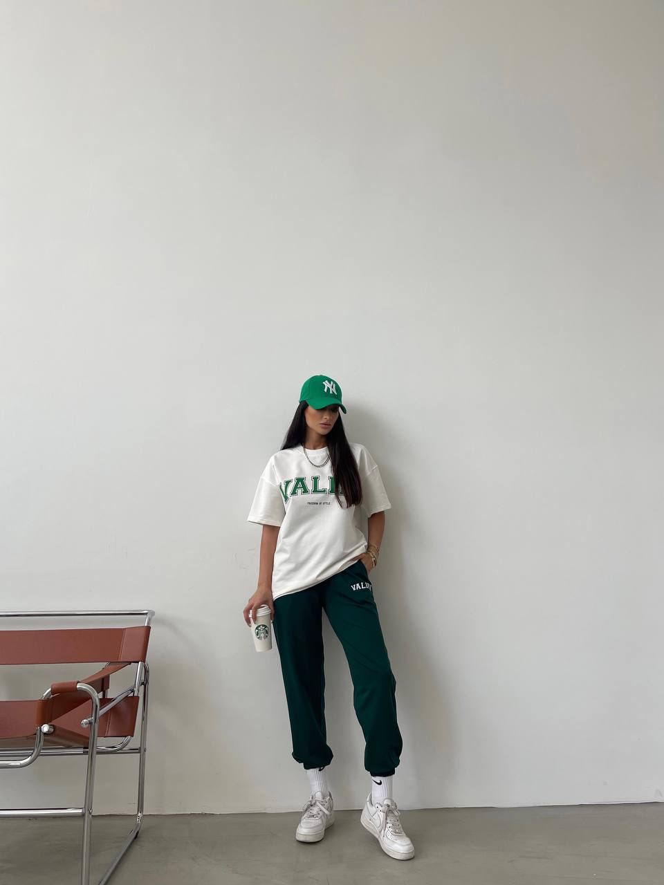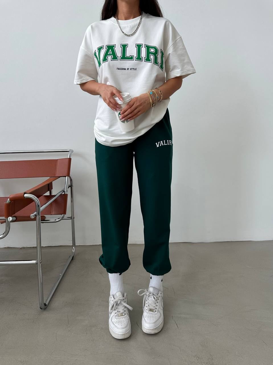 Женский Летний Костюм с Принтом Надписью “Valiri” – Белая Футболка + Зеленые Джоггеры