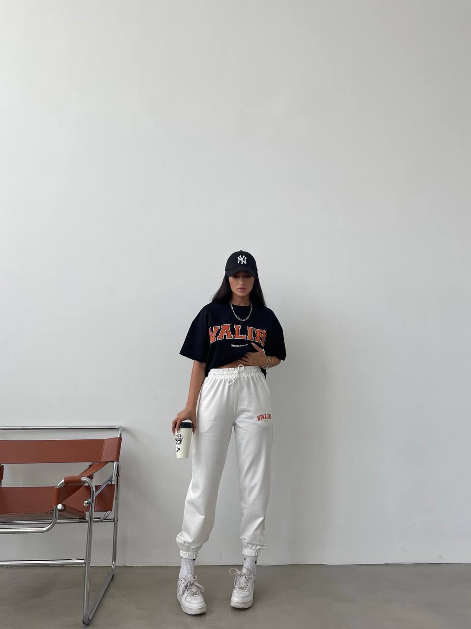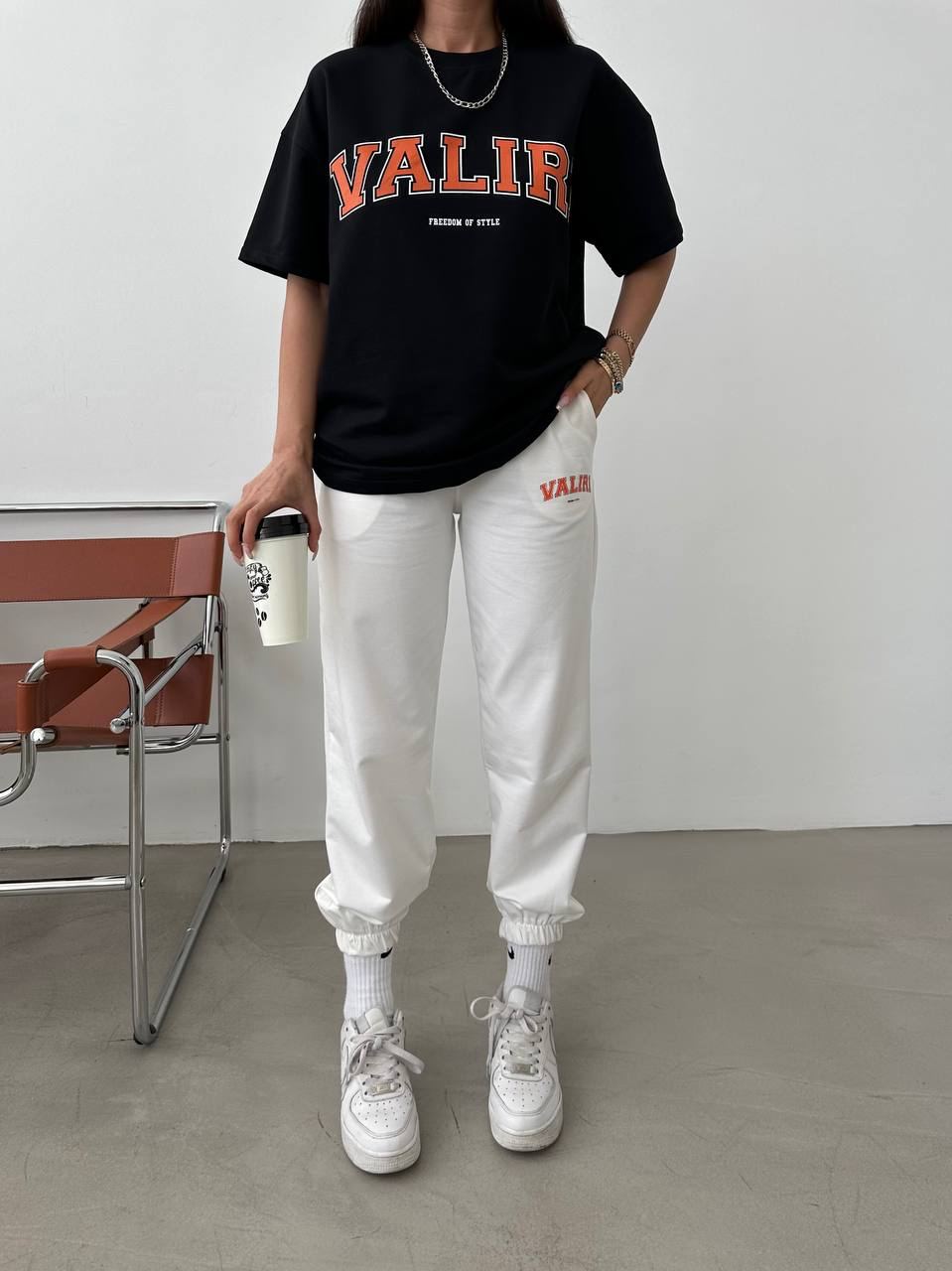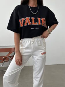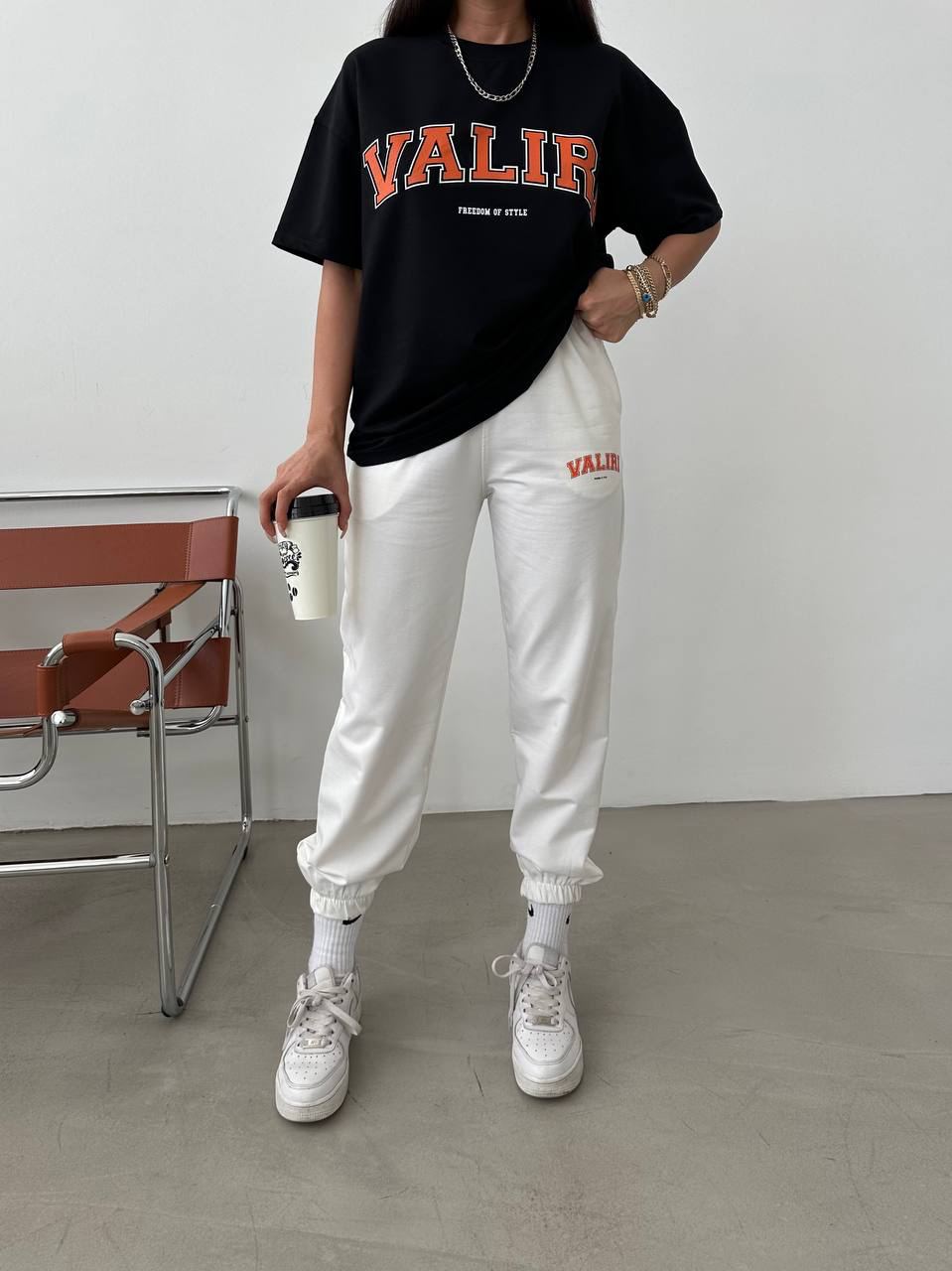 Женский Летний Костюм с Принтом Надписью “Valiri” – Черная Футболка + Белые Джоггеры