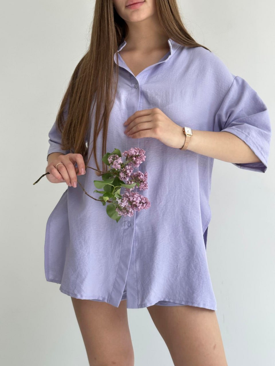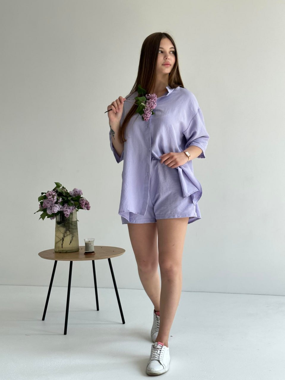 Женский Летний Сиреневый Костюм Свободного Кроя – Рубашка с Укороченными Рукавами + Шорты на Резинке