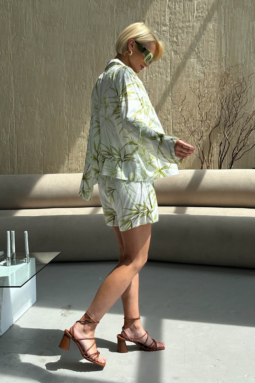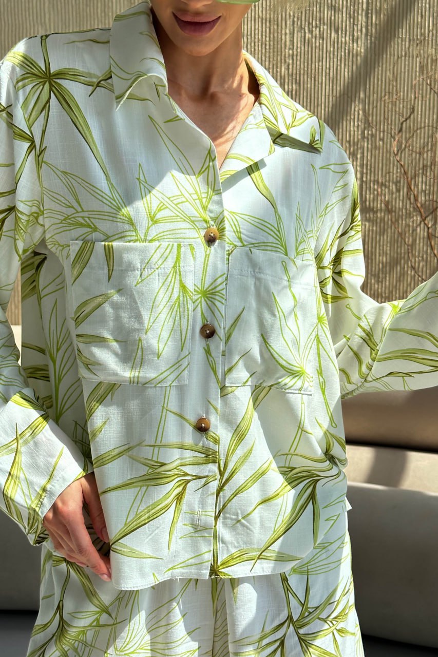 Женский Льняной Летний Белый Костюм Ямайка в Принт – Топ + Рубашка + Шорты