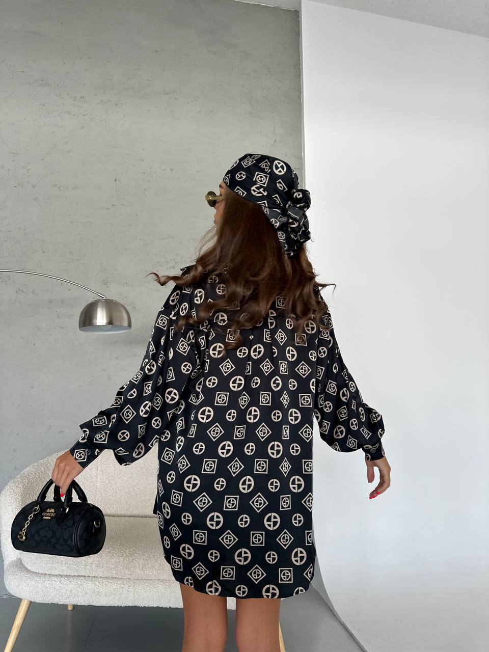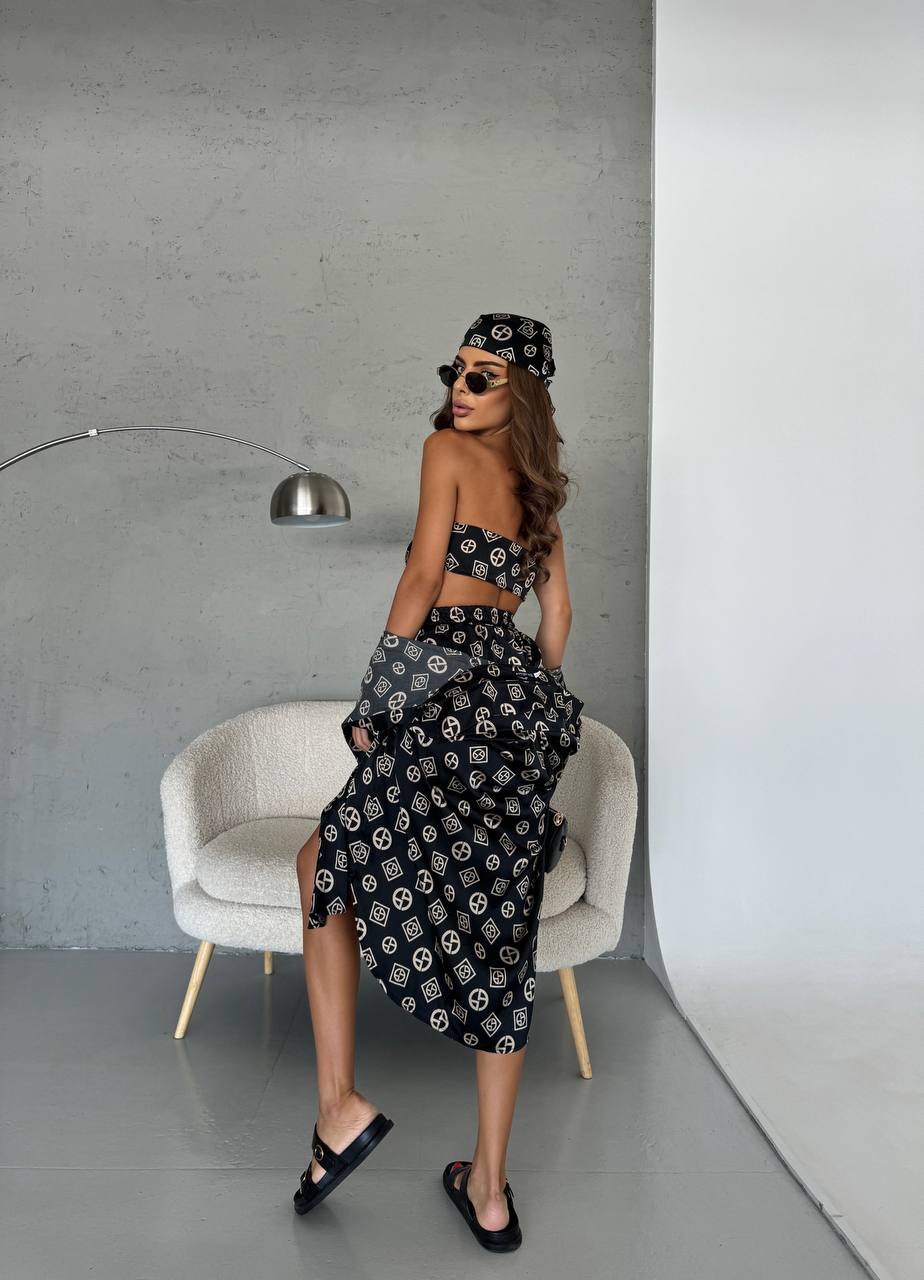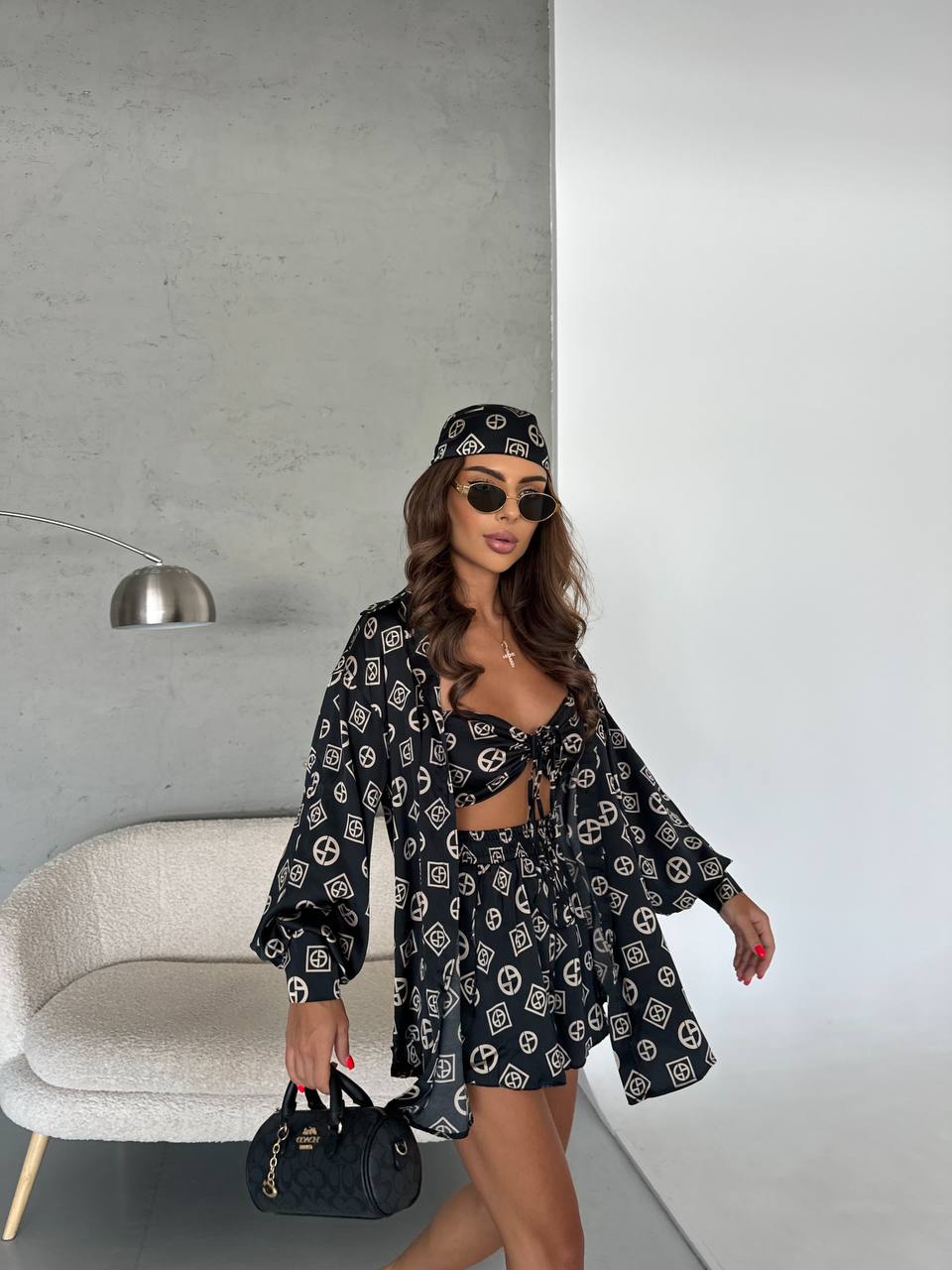 Женский Шелковый Летний Черно-Бежевый Костюм Комплект Четверка в Принт – Топ + Шорты + Рубашка + Бандана