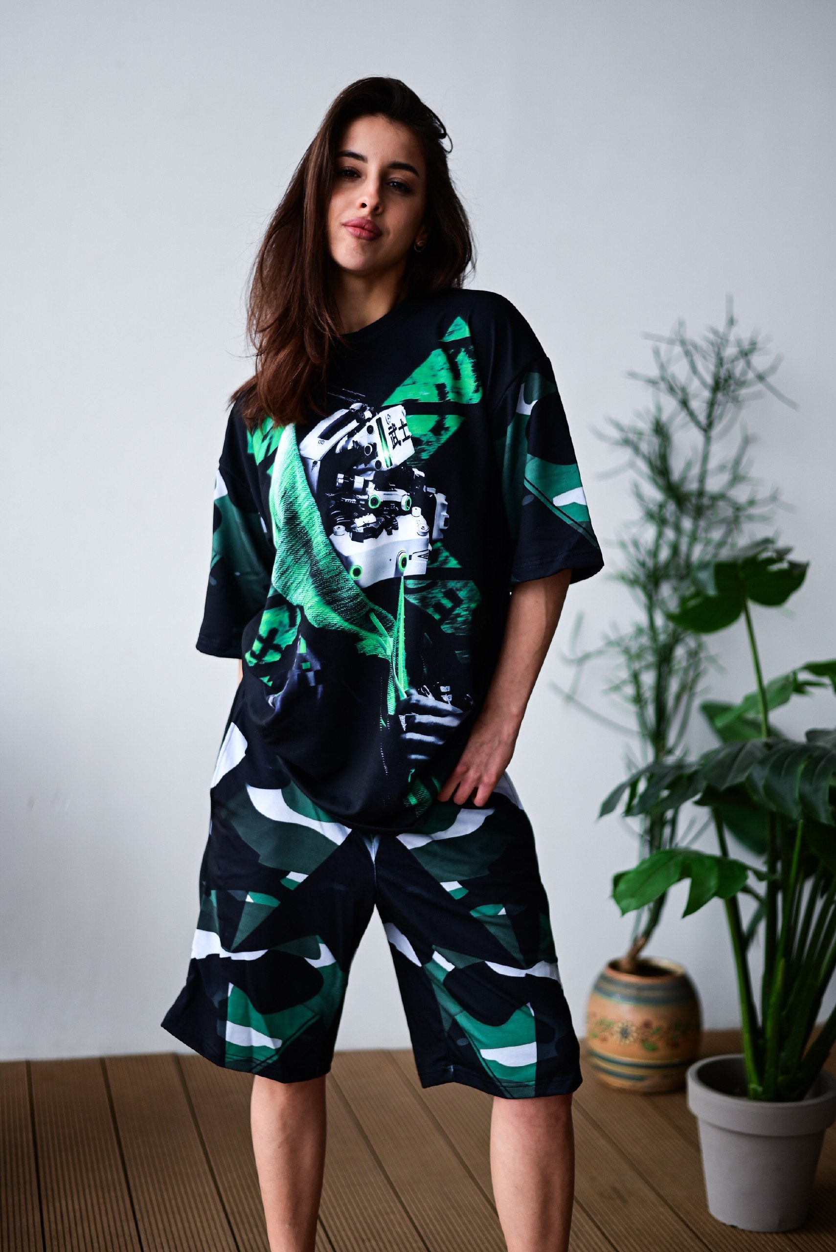 Женский Свободный Черный Летний Костюм Футболка Шорты в Принт