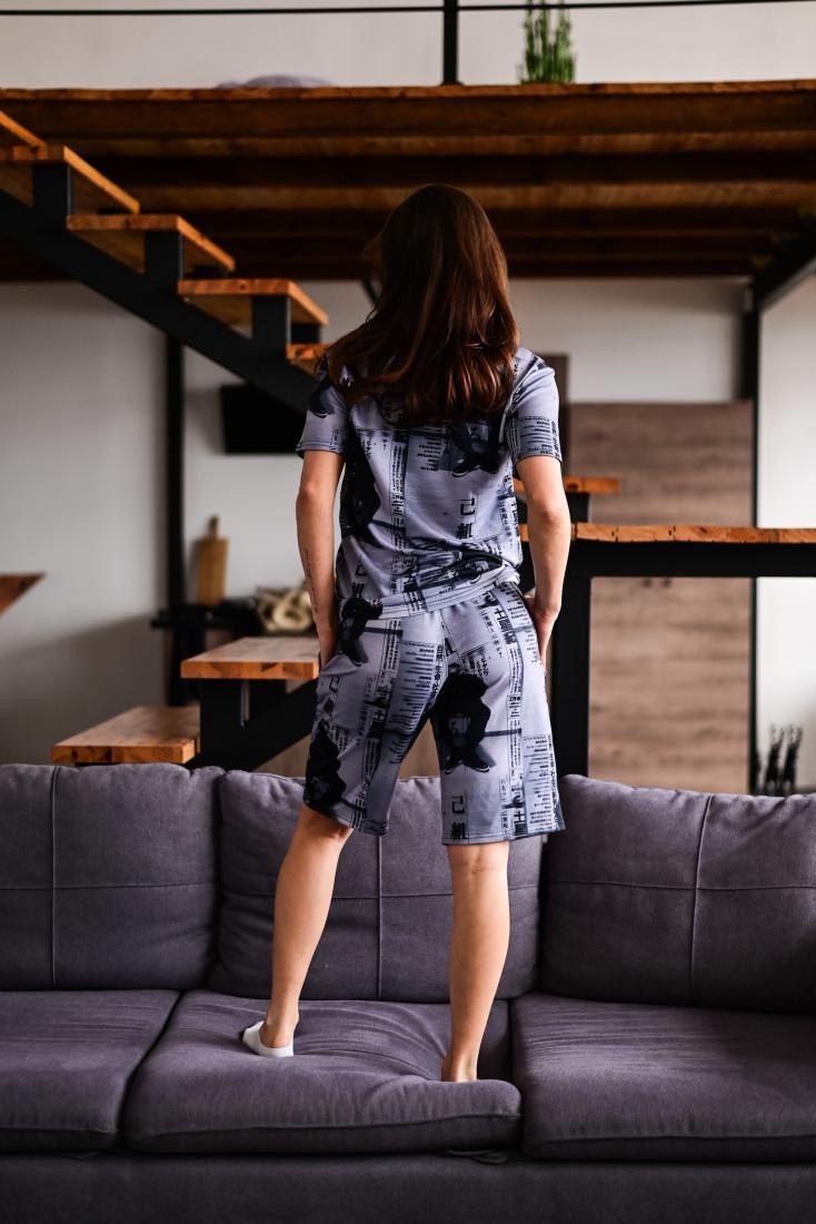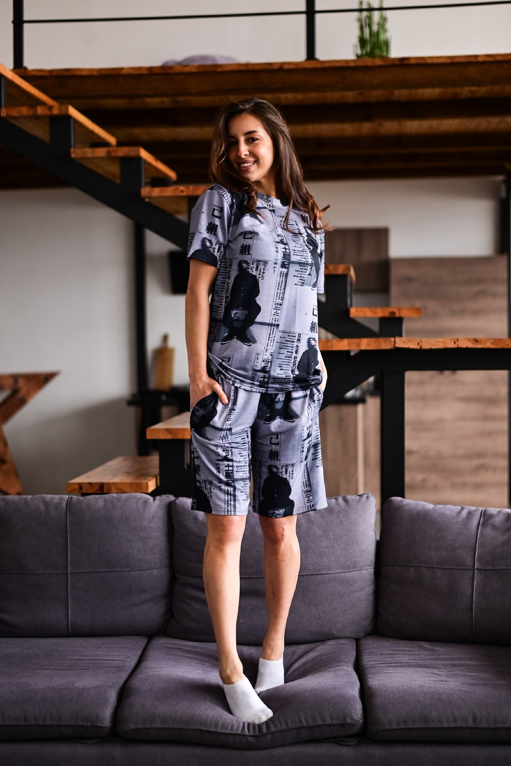 Женский Свободный Серый Летний Костюм Футболка Шорты в Принт