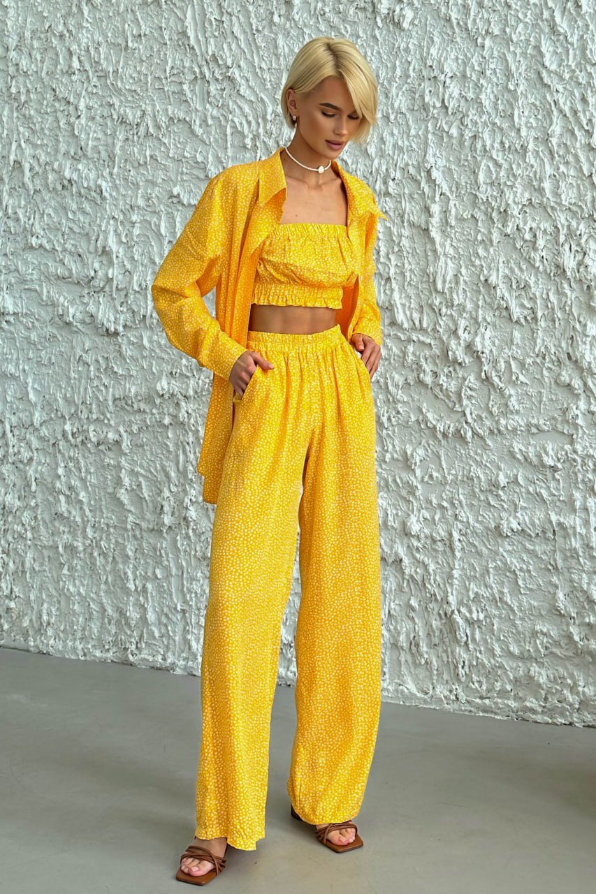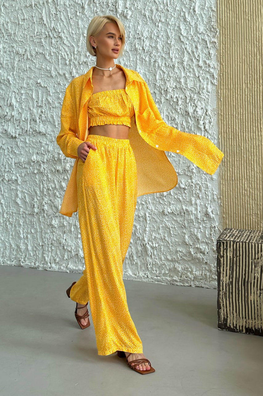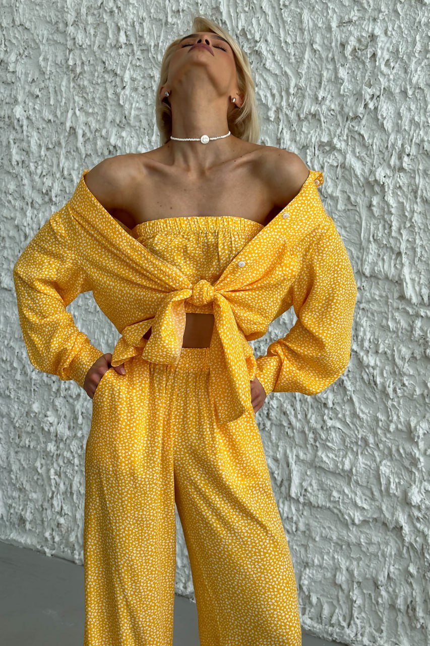Женский Желтый Костюм Тройка Шторм в Белых Точках – Топ + Рубашка + Штаны
