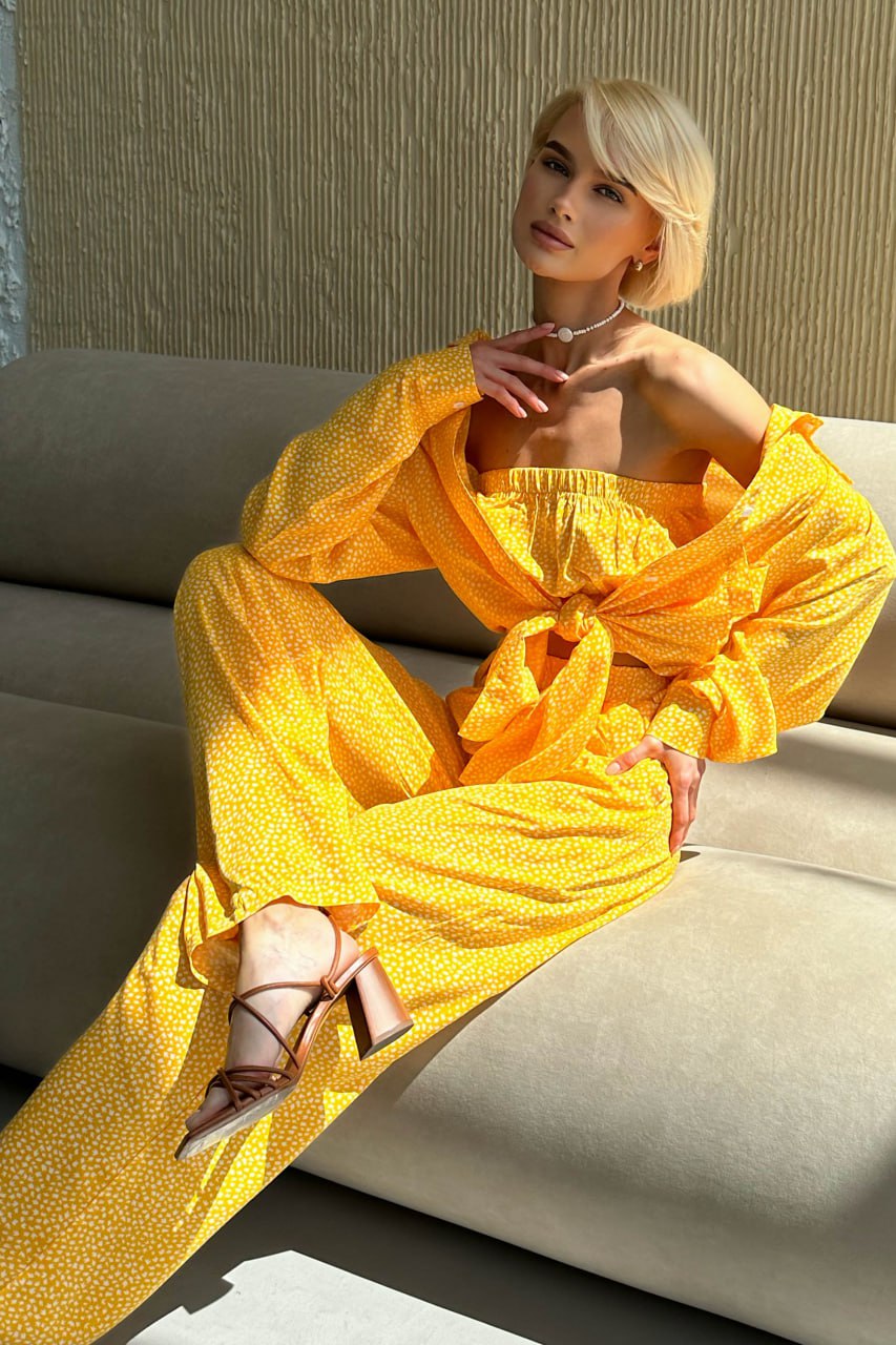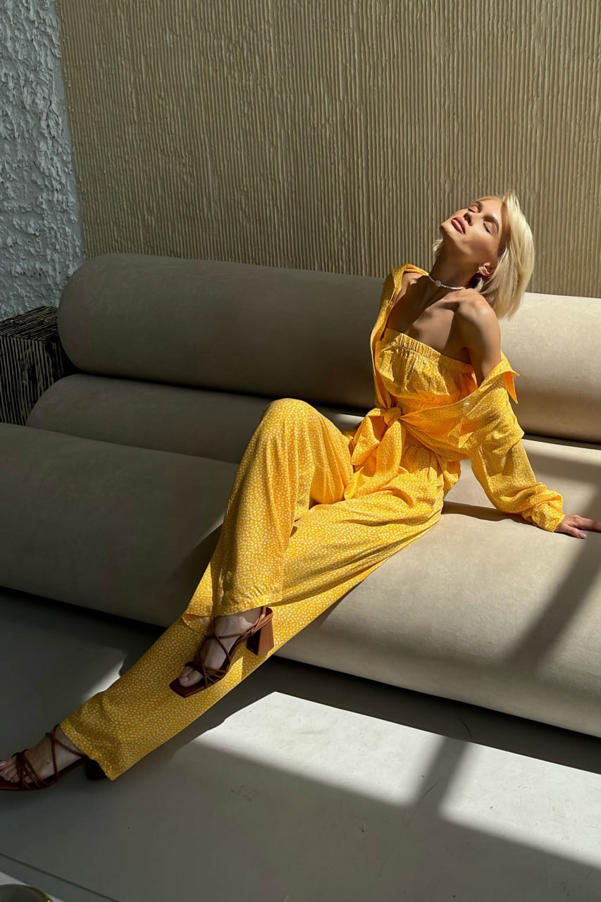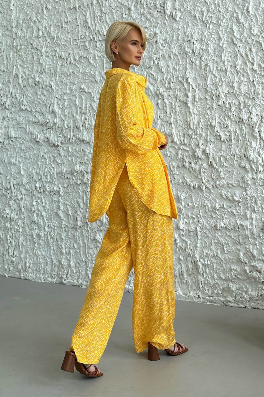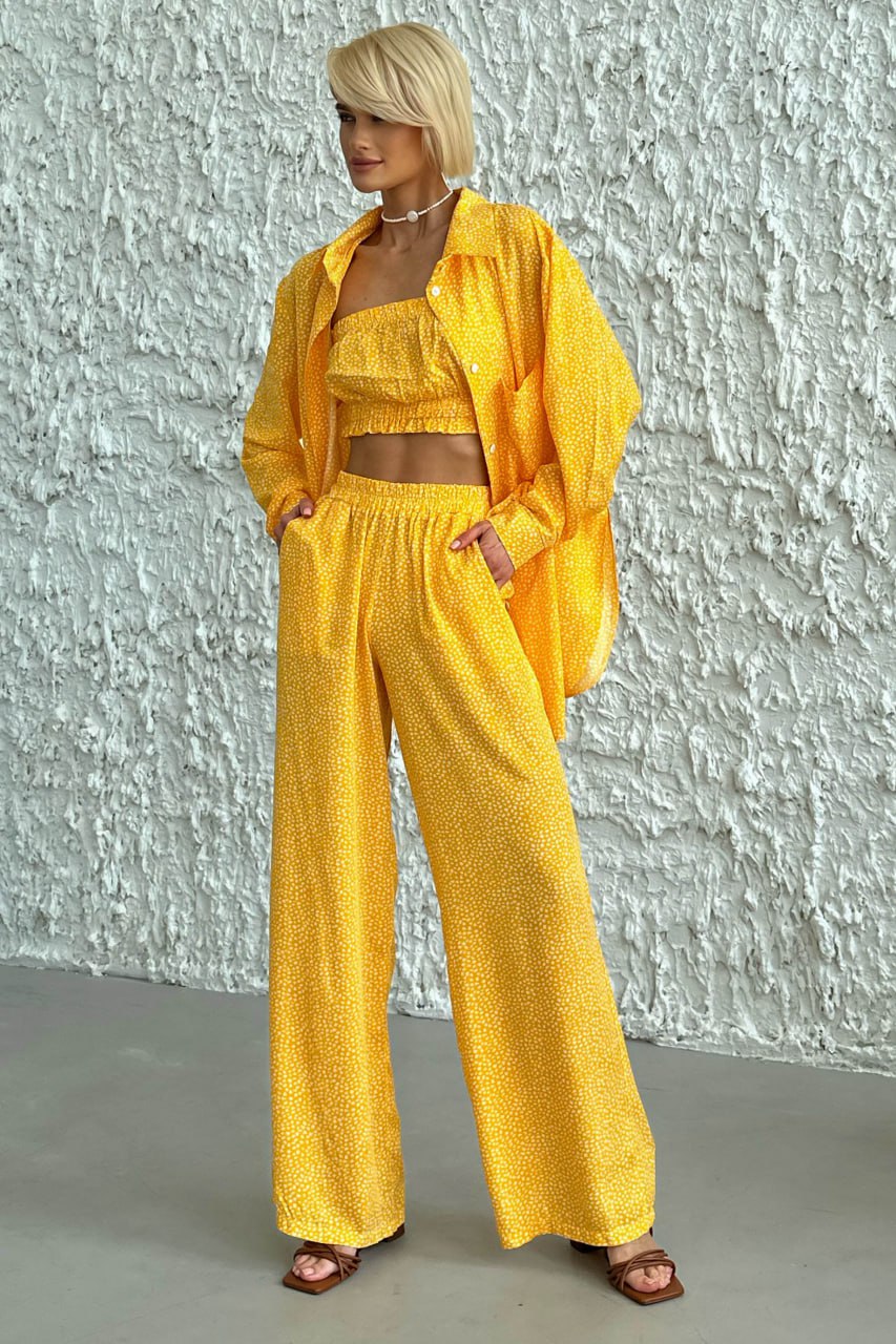 Женский Желтый Костюм Тройка Шторм в Белых Точках – Топ + Рубашка + Штаны