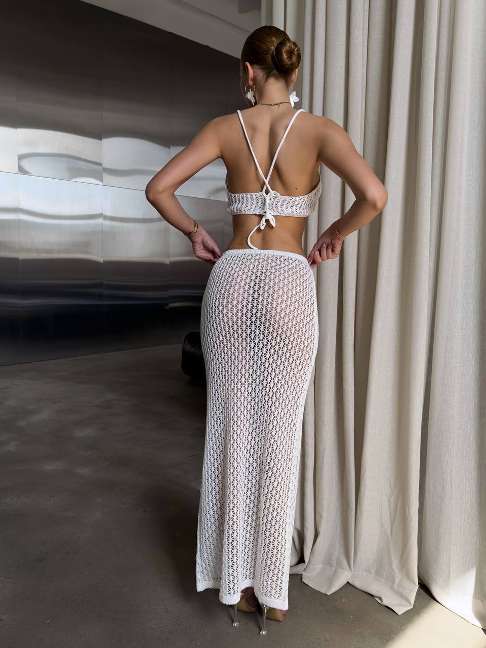 Женский Белый Пляжный Комплект с Ажурной Вязки – Укороченный Топ + Длинная Юбка