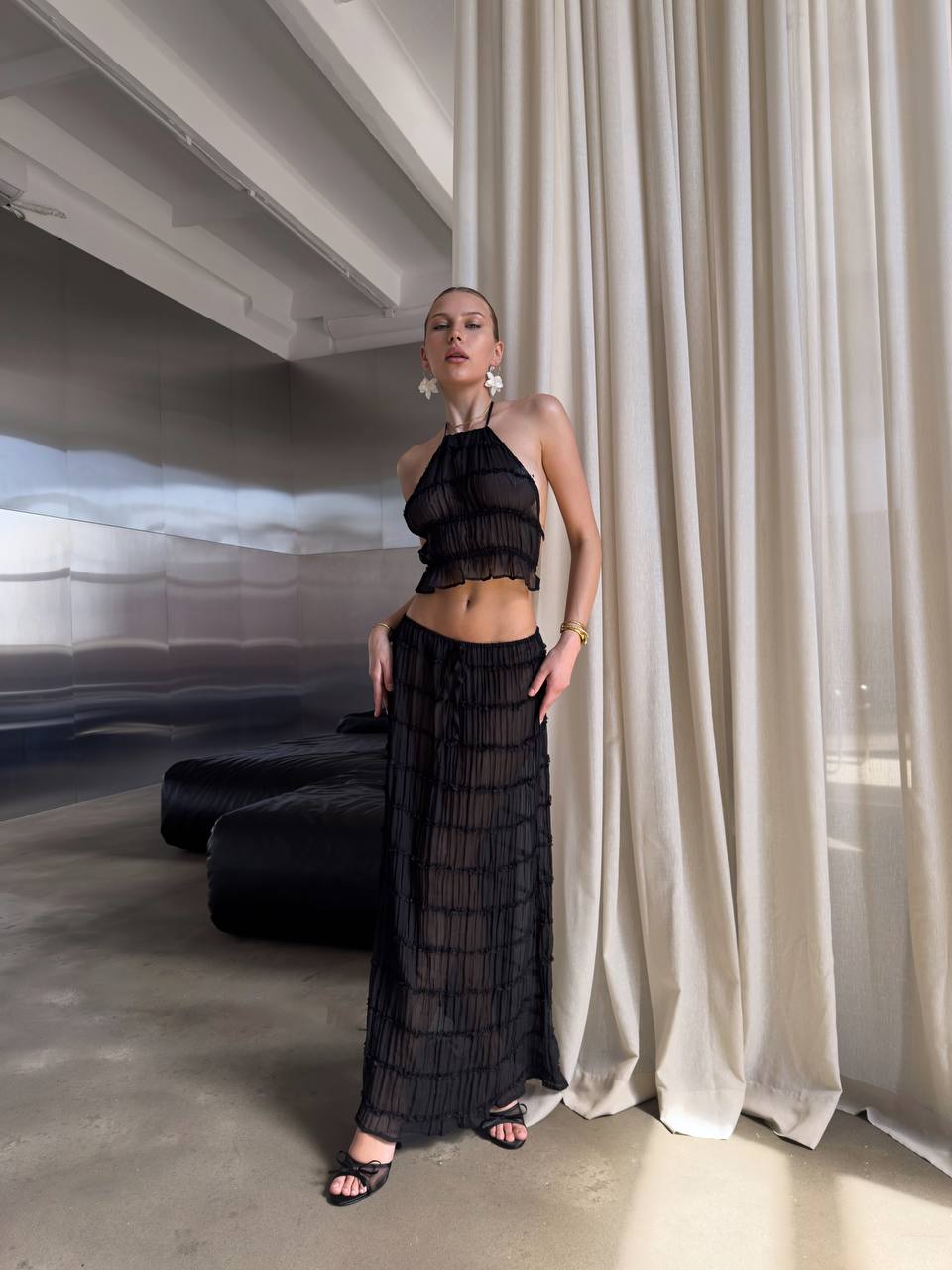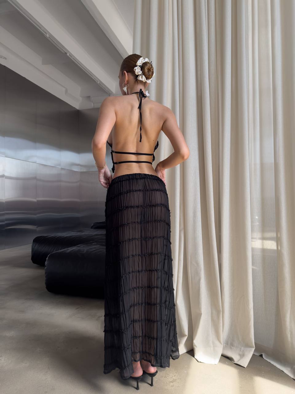 Женский Легкий Полупрозрачный Черный Пляжный Комплект с Открытой Спиной (Топ + Юбка)