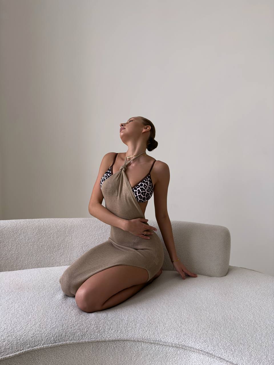 Женское Длинное Пляжное Платье Мокко с Завязкой на Шее и Разрезом Сбоку