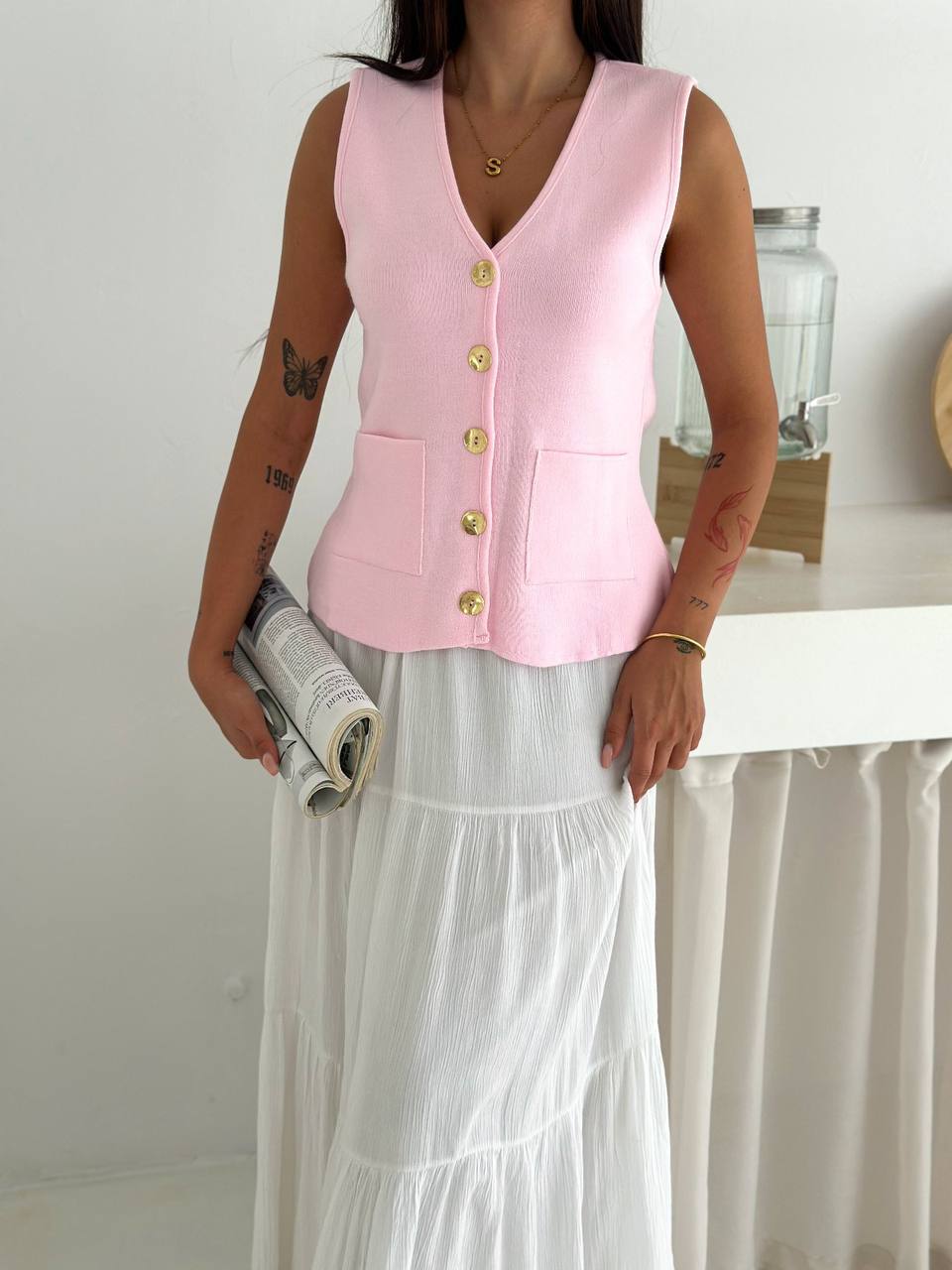 Женский Базовый Розовый Жилет на Пуговицах с V-образным Вырезом и Карманами