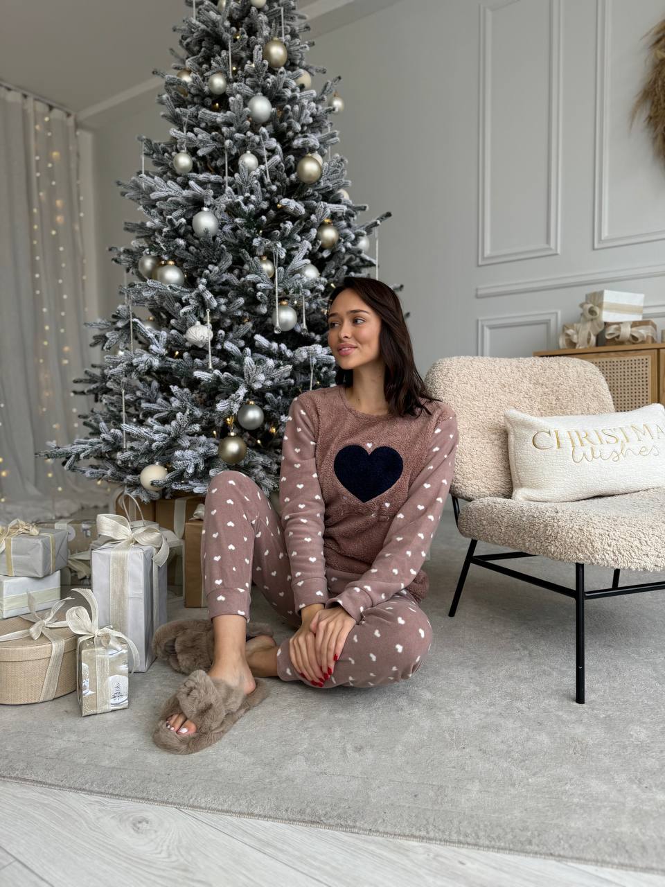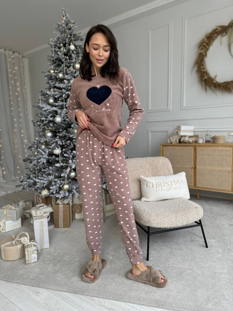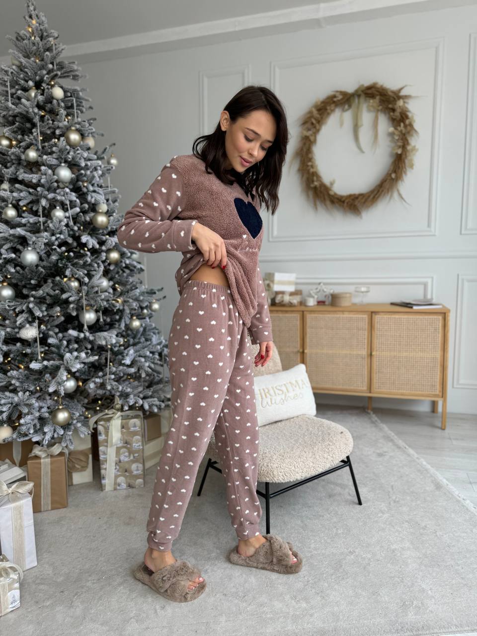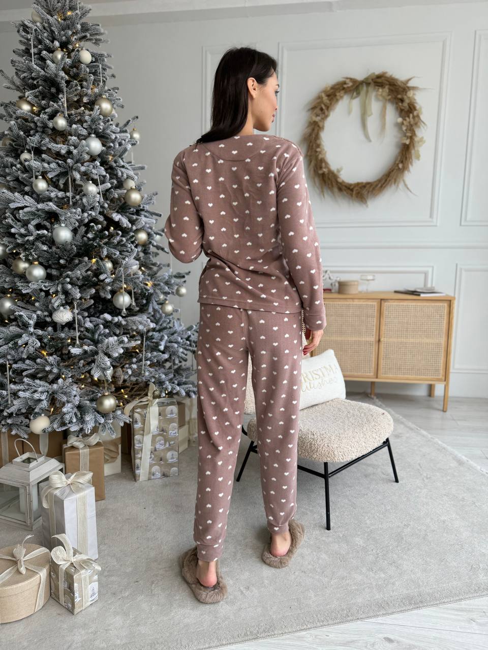 Женская Теплая Махровая Пижама Мокко с Сердечками (Кофта + Штаны)