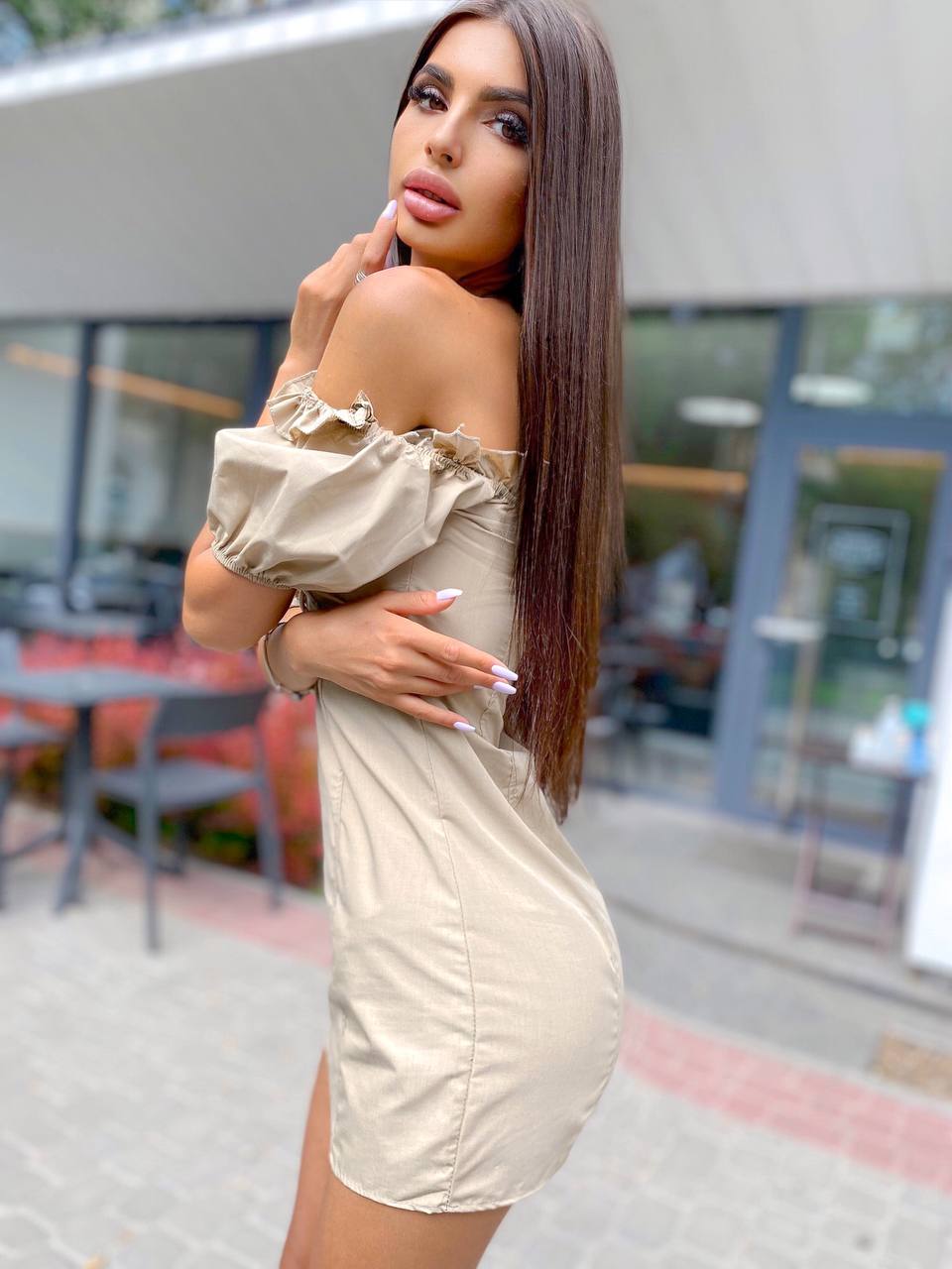 Женский Сарафан Мини Бежевый – Летний Котон с Пышным Рукавом на Шнуровке