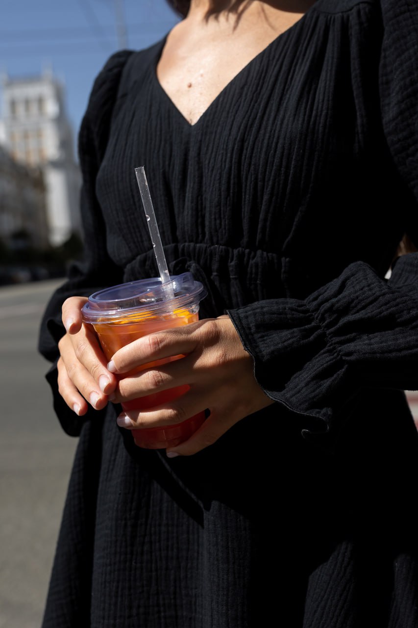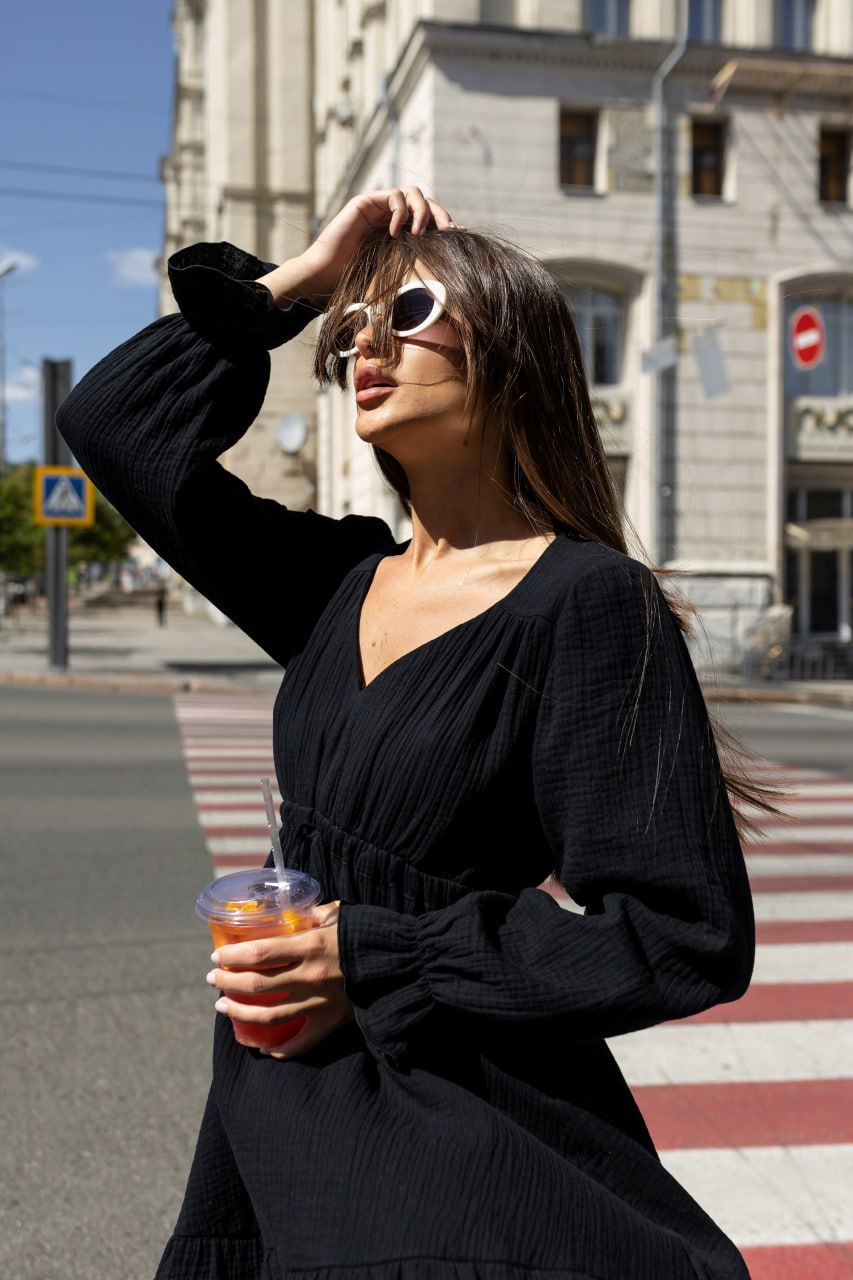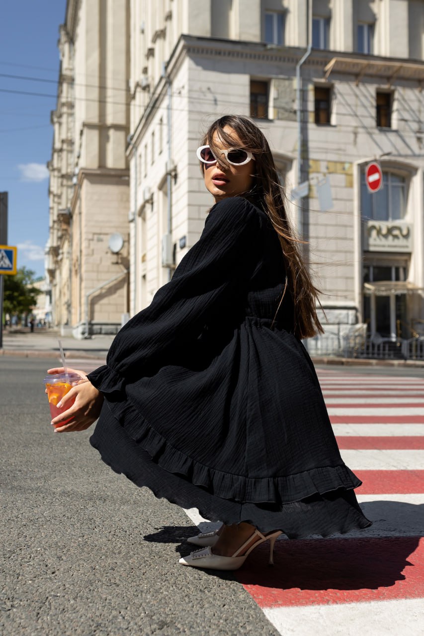 Женское Черное Платье Джелі Мини – Легкое Муслиновое с Рюшами и Затяжкой на Талии