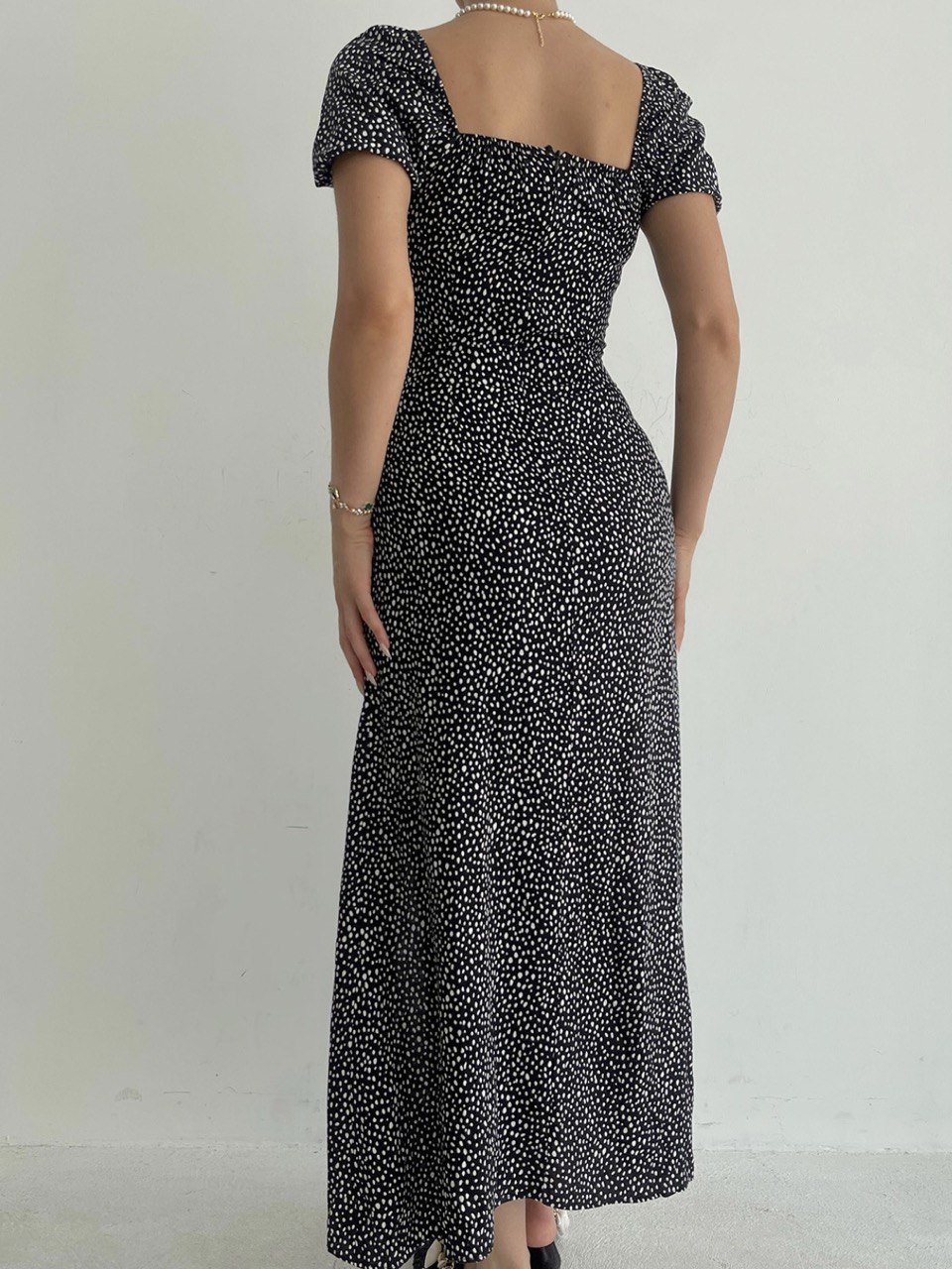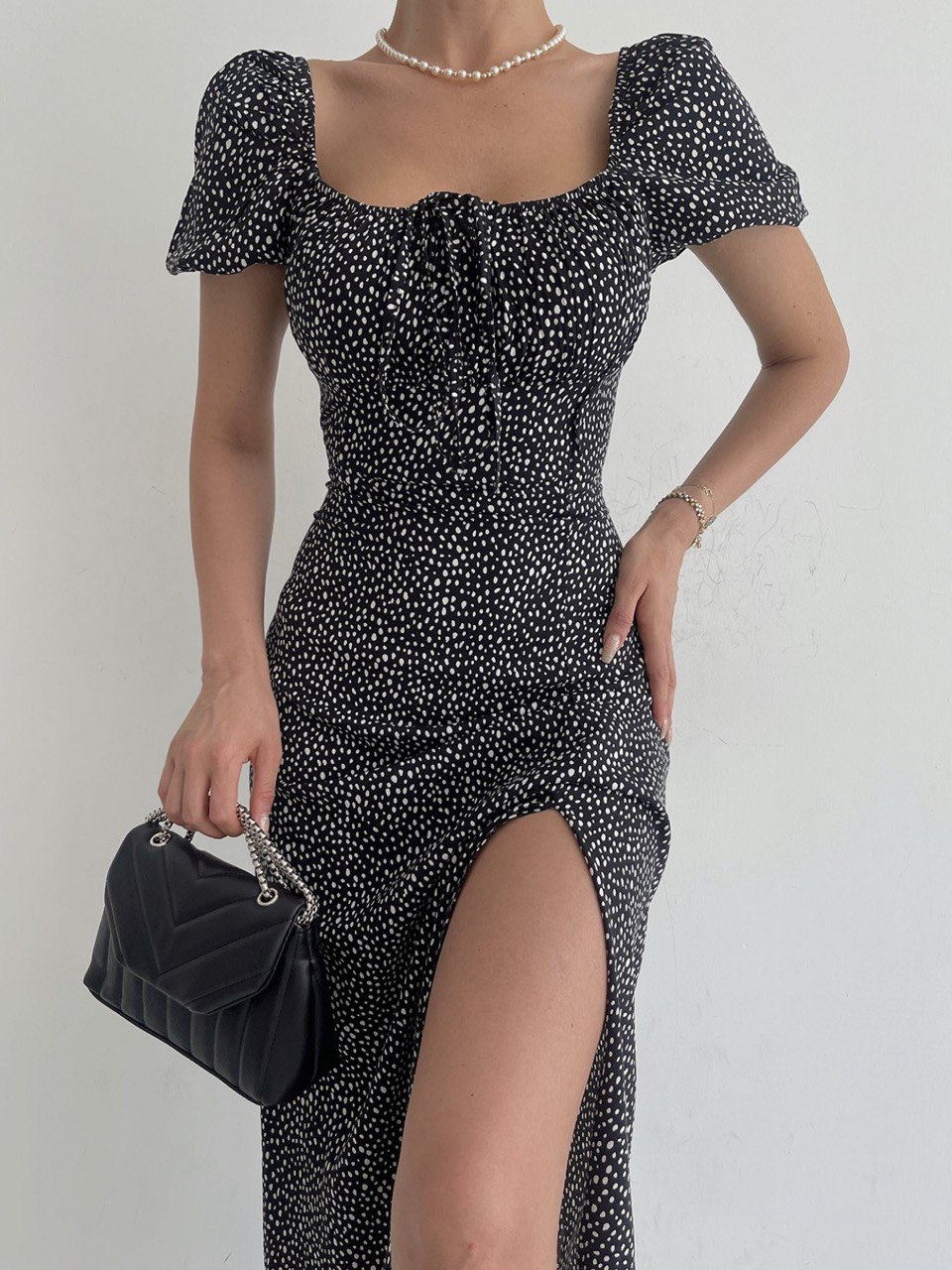 Женское Черное Платье Миди в Гороховый Принт – Летнее Приталенное с Разрезом на Ноге