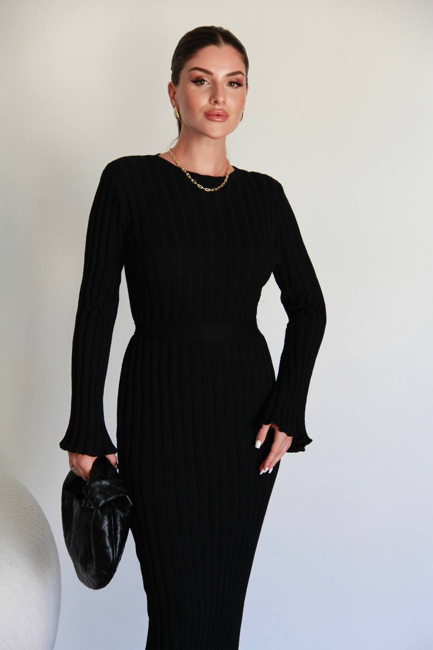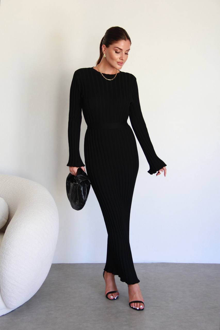 Женское Длинное Черное Платье Макси с Поясом и Удлиненными Рукавами