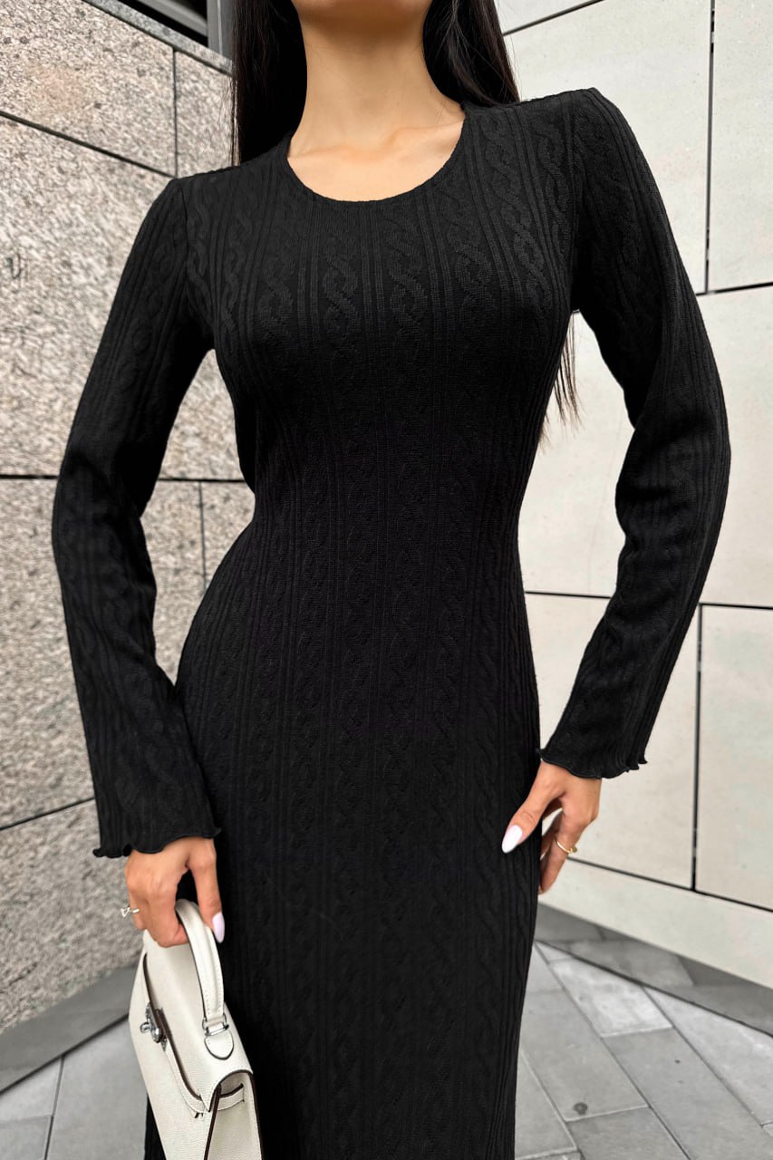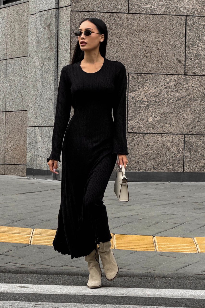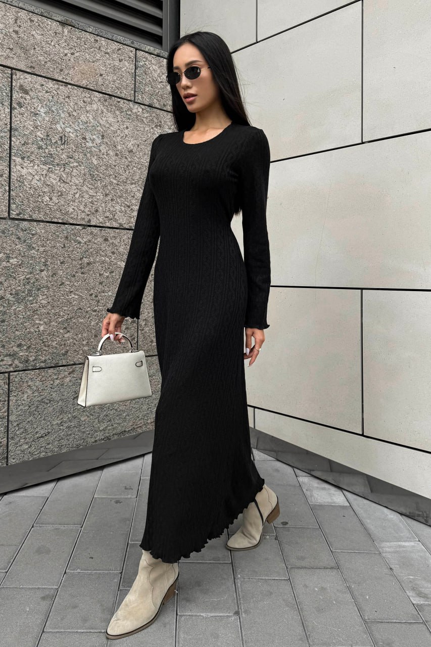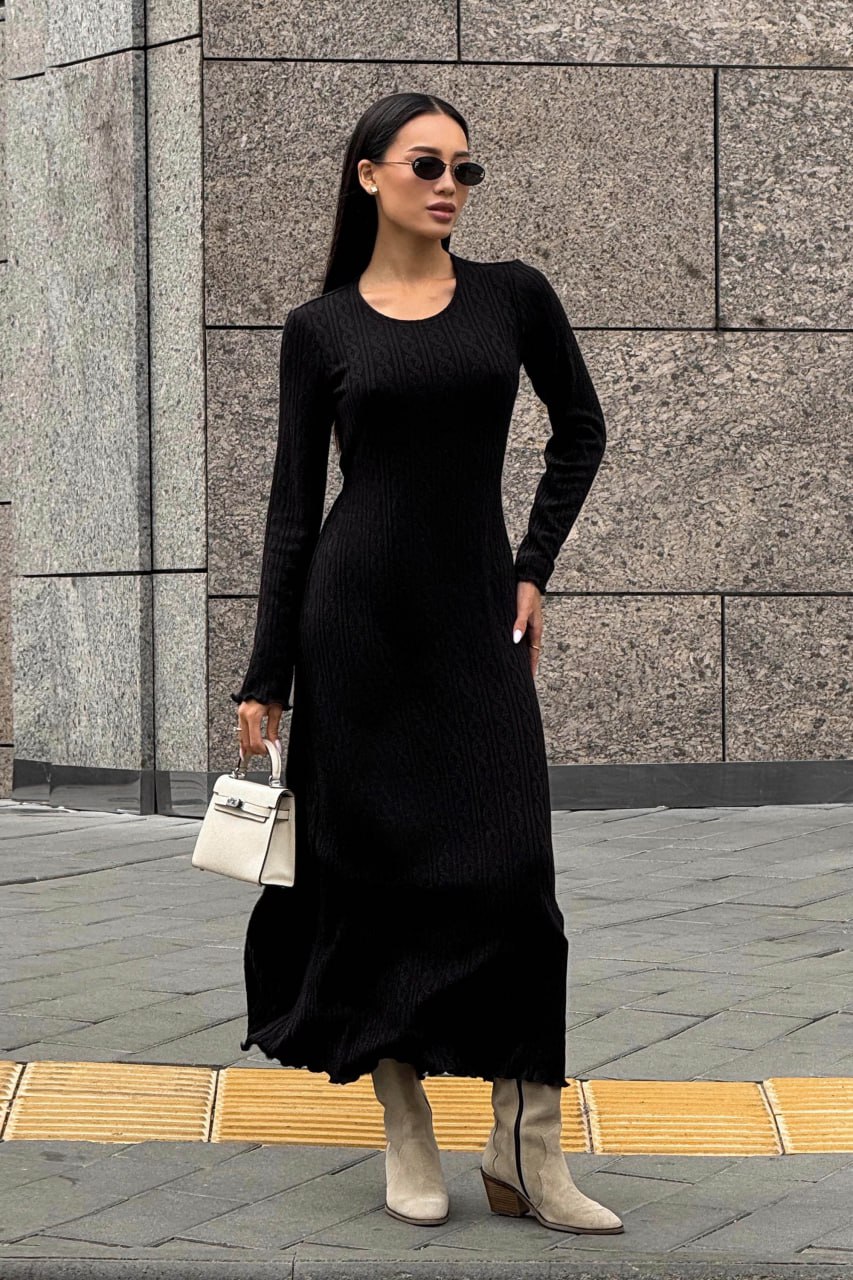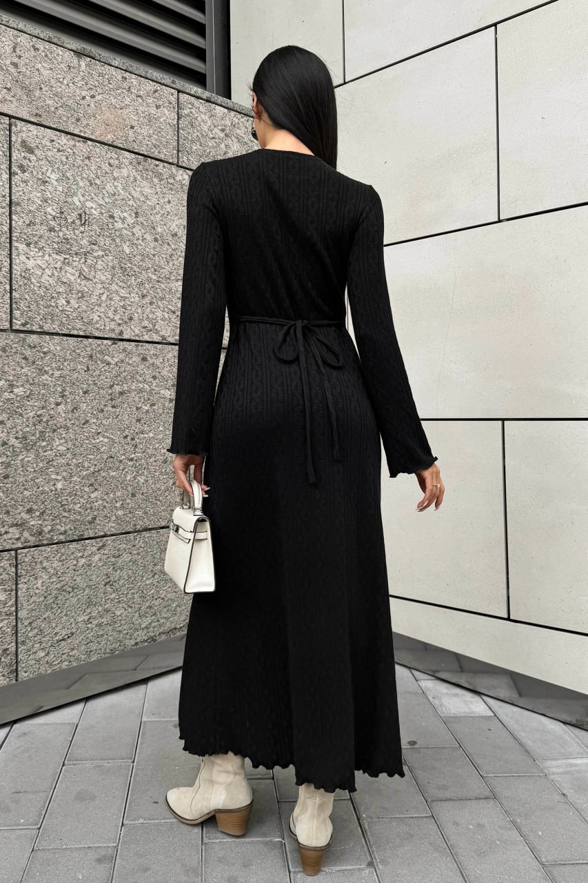 Женское Длинное Черное Платье Нисса – Свободное с Фактурным Узором и Завязкой Сзади на Талии