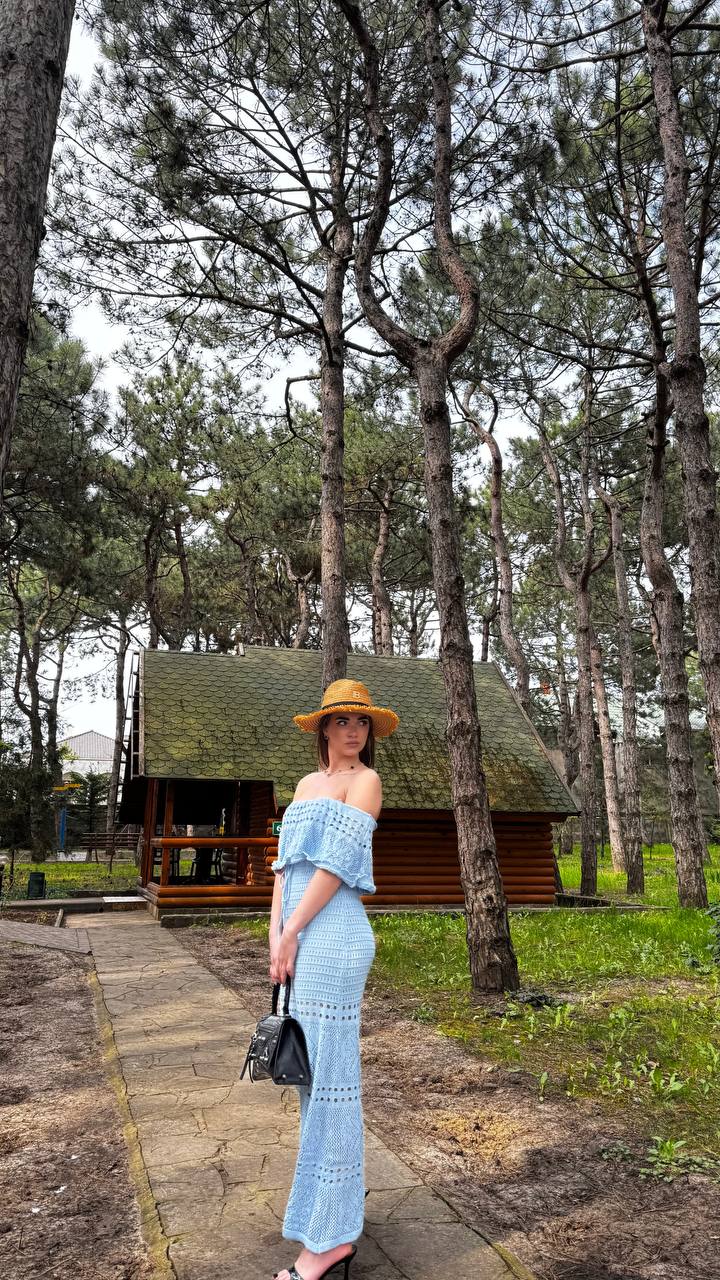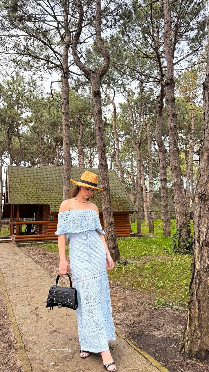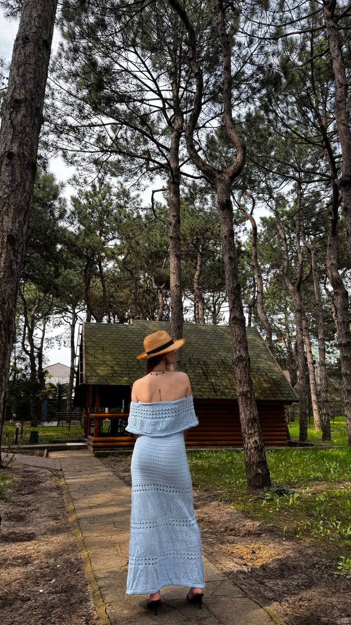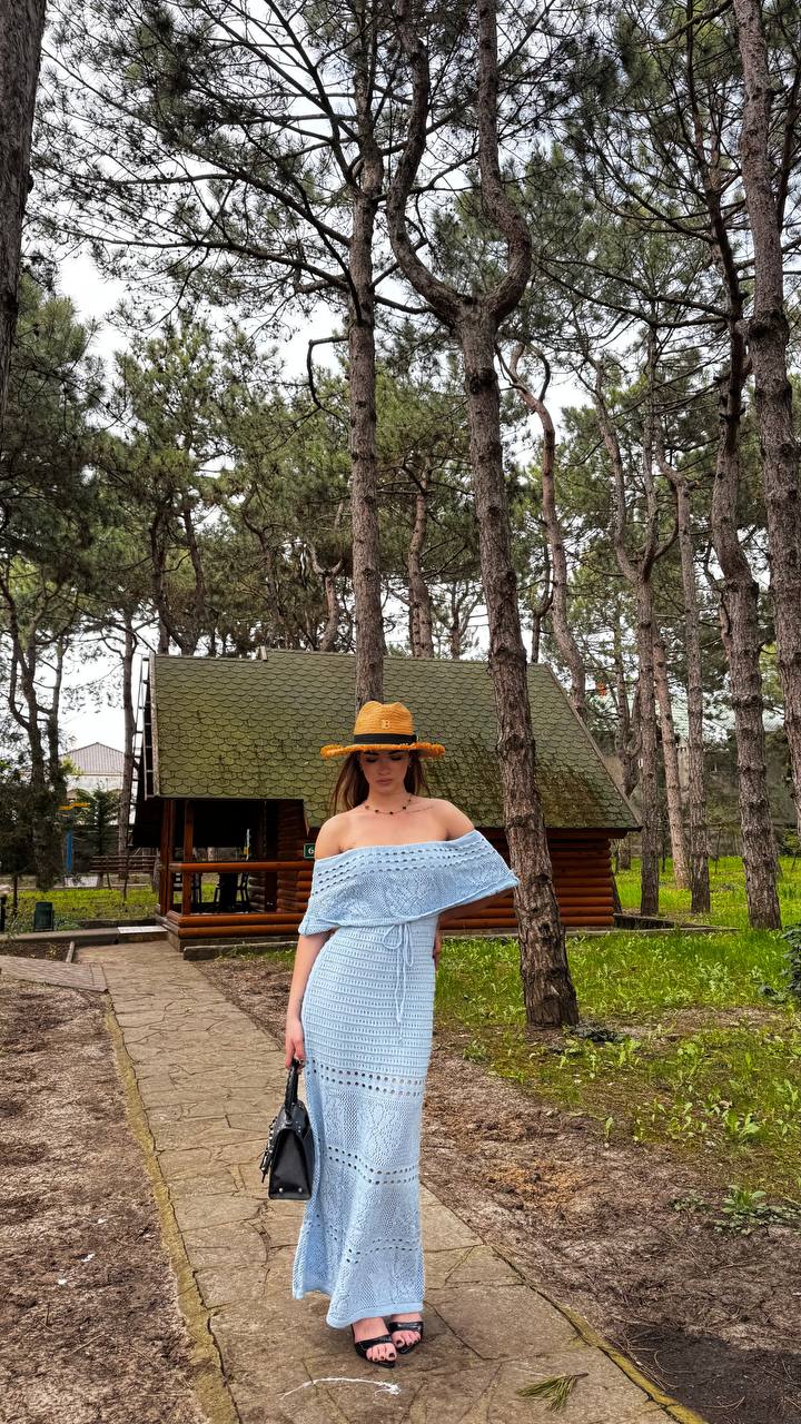 Женское Длинное Голубое Платье Макси Ажурной Вязки с Открытыми Плечами и Завязкой на Талии