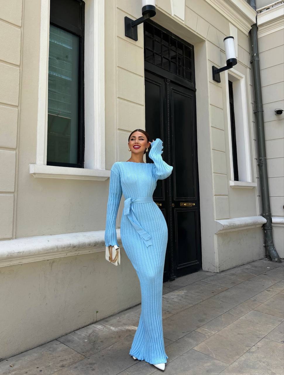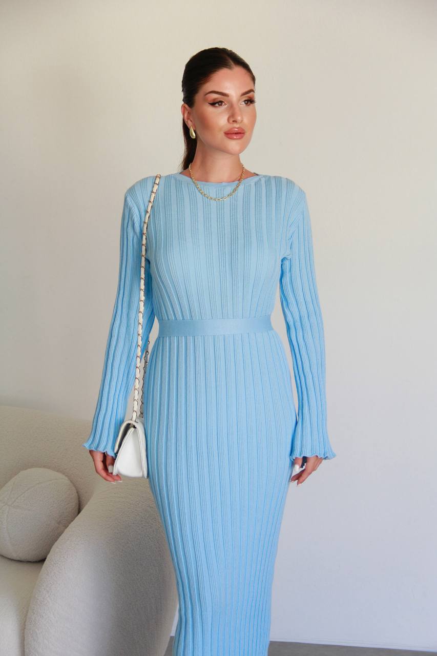 Женское Длинное Голубое Платье Макси с Поясом и Удлиненными Рукавами