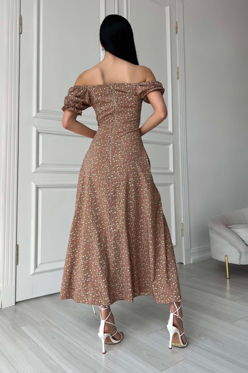 Женское Длинное Кофейное Платье Амби Макси – в Принт Мелких Цветочках с Разрезом Рюшами и Короткими Рукавами