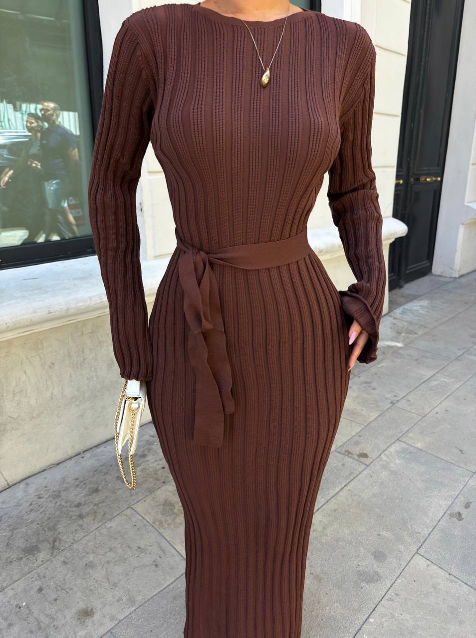 Женское Длинное Коричневое Платье Макси с Поясом и Удлиненными Рукавами