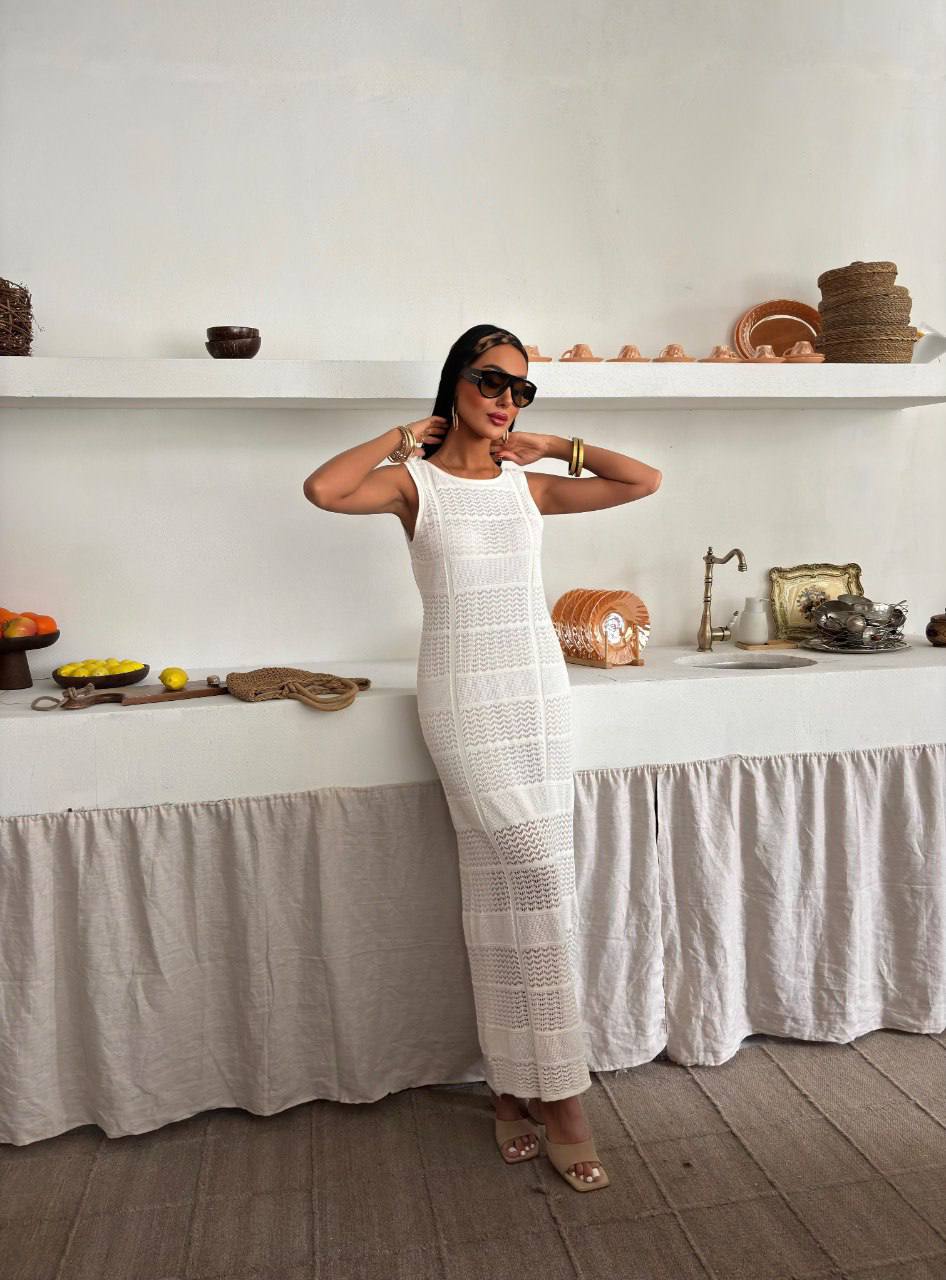 Женское Длинное Летнее Белое Платье Ажурной Вязки без Рукавов с Открытой Спиной