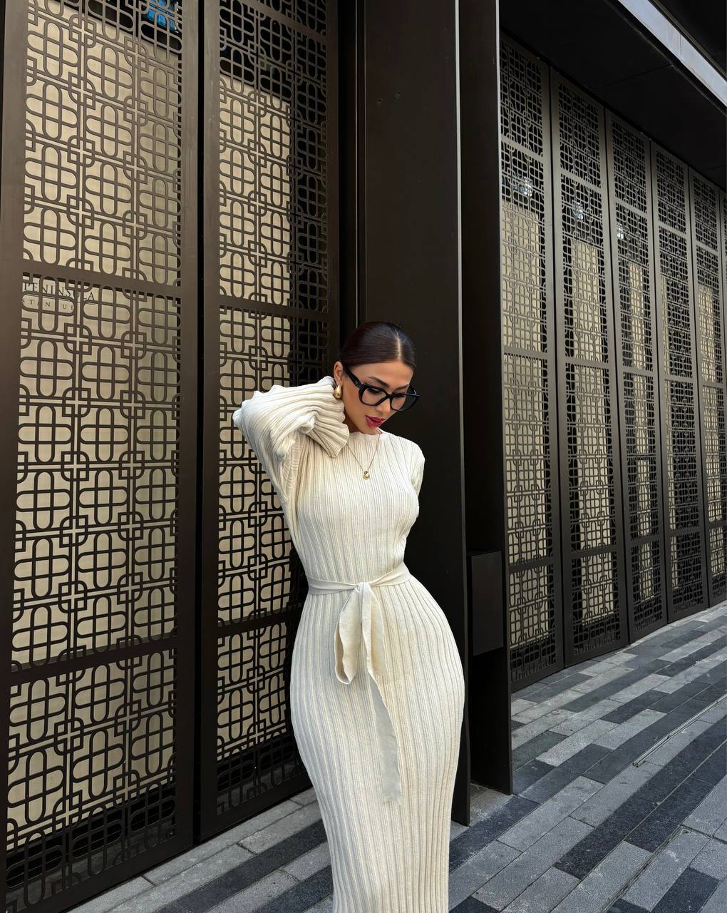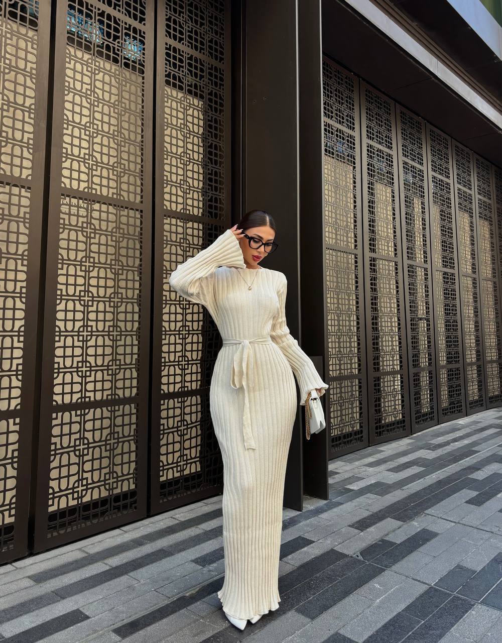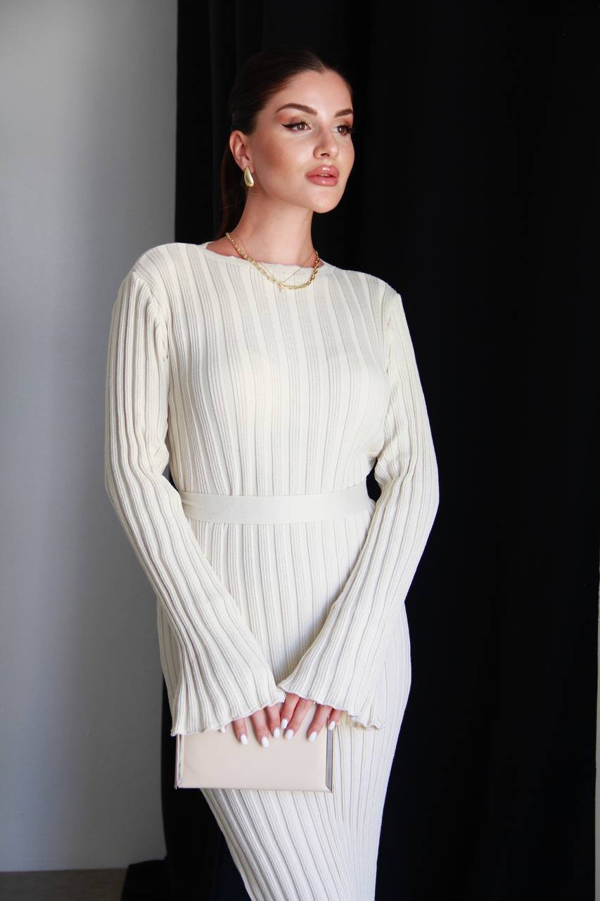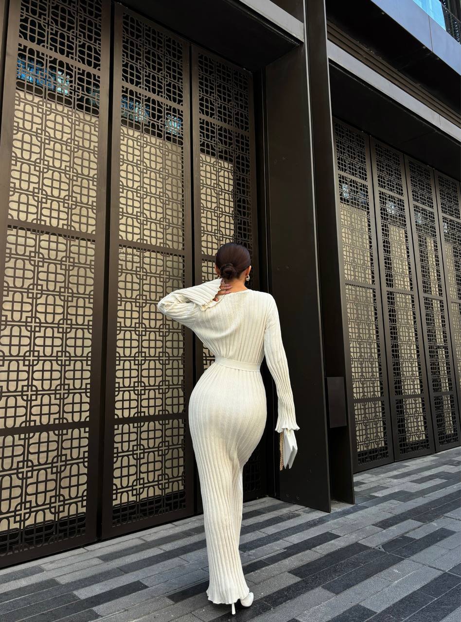 Женское Длинное Молочное Платье Макси с Поясом и Удлиненными Рукавами