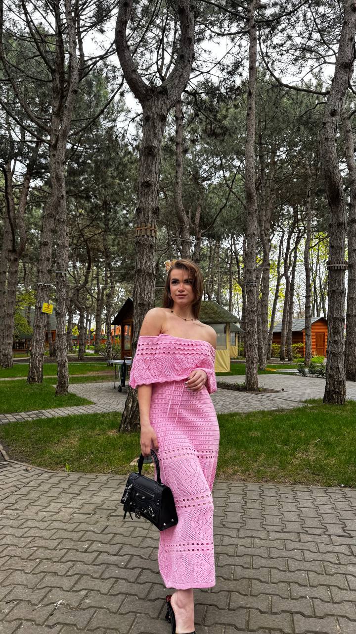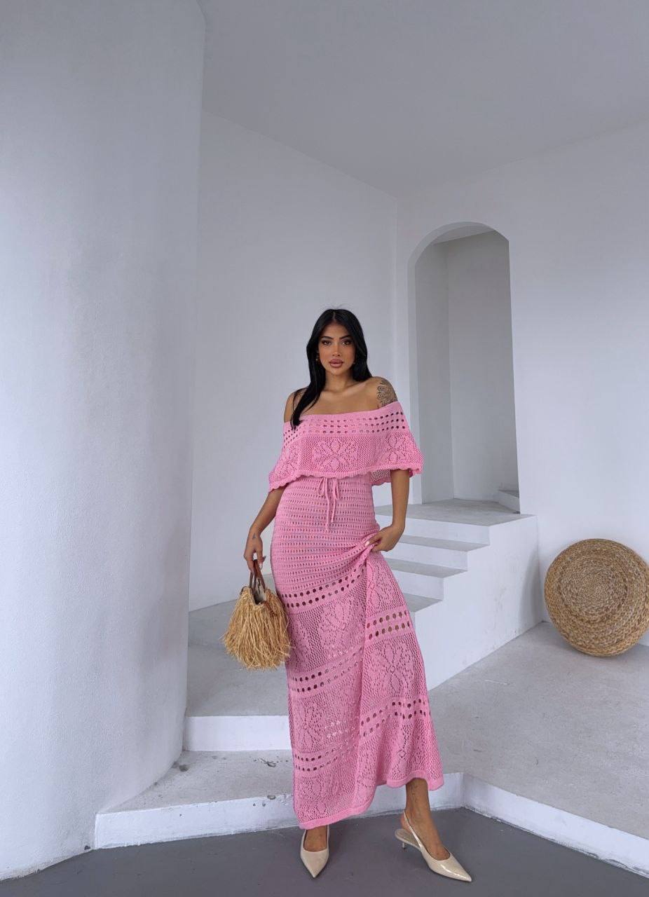 Женское Длинное Розовое Платье Макси Ажурной Вязки с Открытыми Плечами и Завязкой на Талии