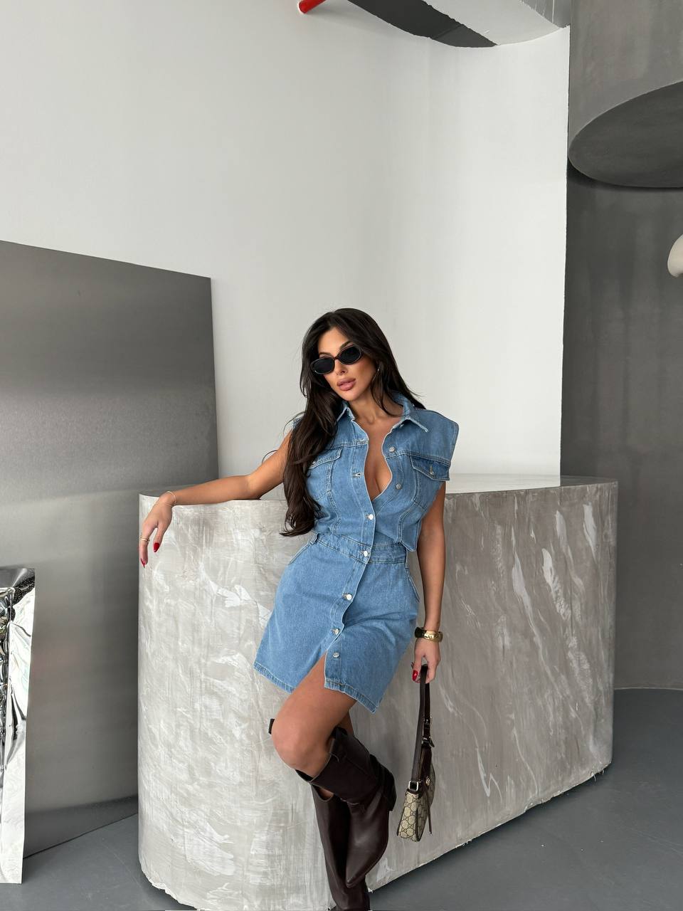 Женское Джинсовое Приталенное Голубое Платье Мини на Пуговицах без Рукавов